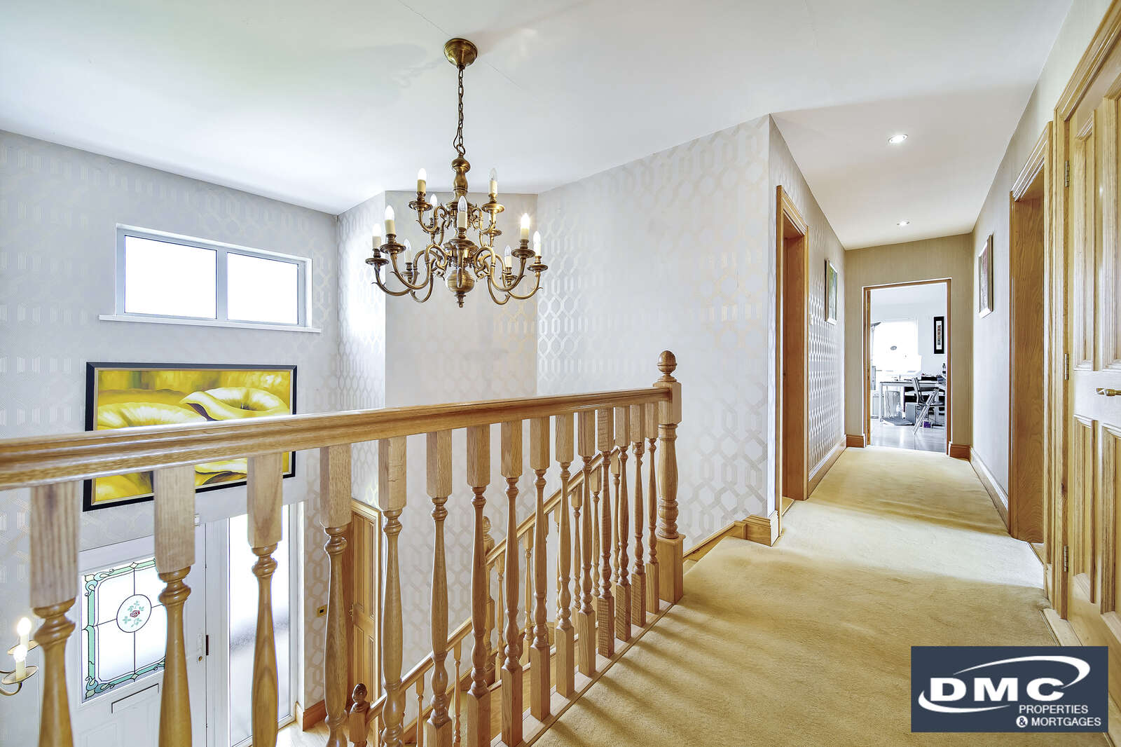 Gallery Landing :Oak staircase. Shelved Hotpress / Linen Cupboard. Feature window enjoying beautiful views of Lough Foyle and The Donegal Hills.