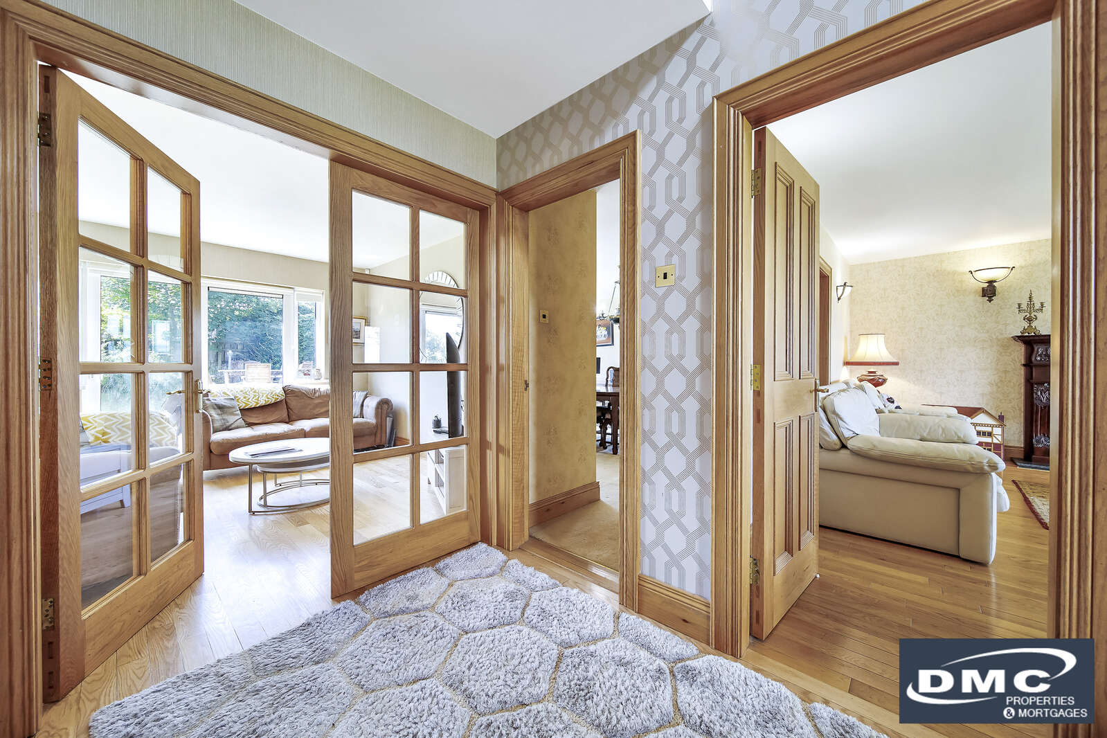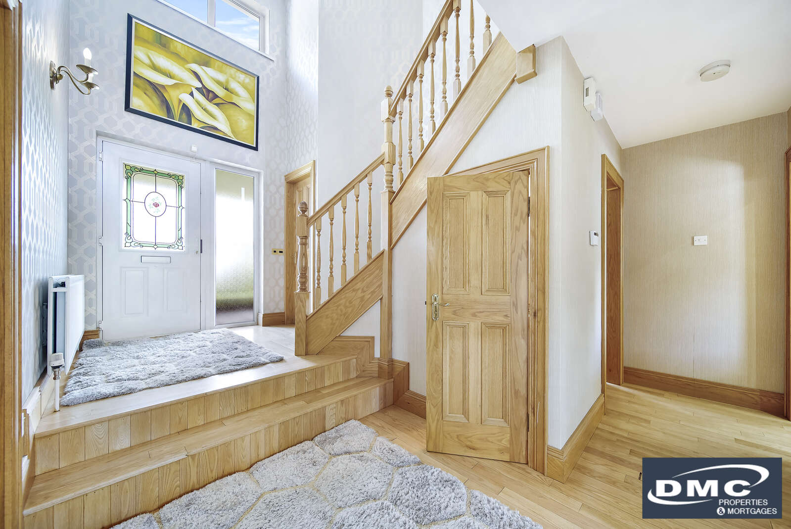 Reception Hall With Ground Floor Toilet :Upvc front door with double glazed centre light and side screen. Solid oak floor. Feature oak half turn staircase. Steps leading down into living accommodation.