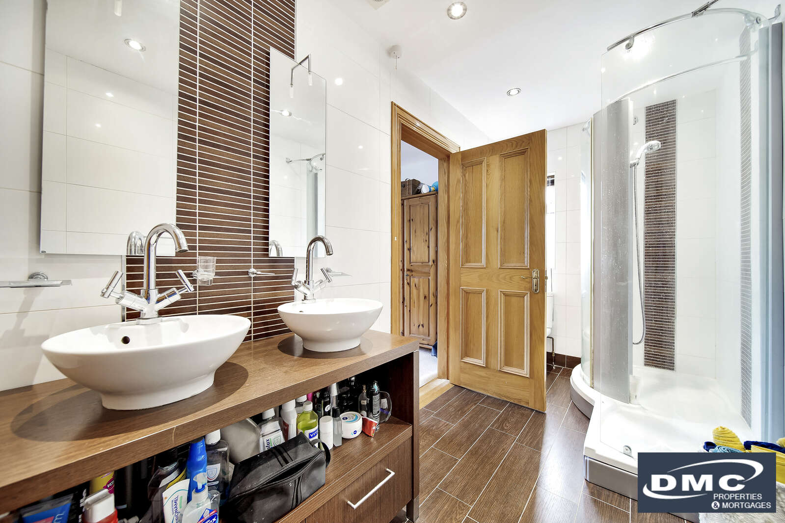Jack and Jill Ensuite Shower Room :White four piece Designer suite comprising walk in shower pod with drying area and power shower. Vanity unit with twin wash hand basin and wall mirrors. Low flush w.c. Modern tiling to walls and floor. Recessed lights to ceiling.