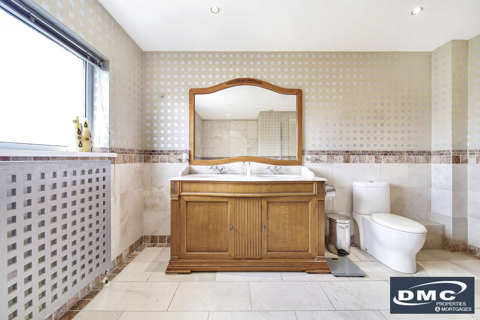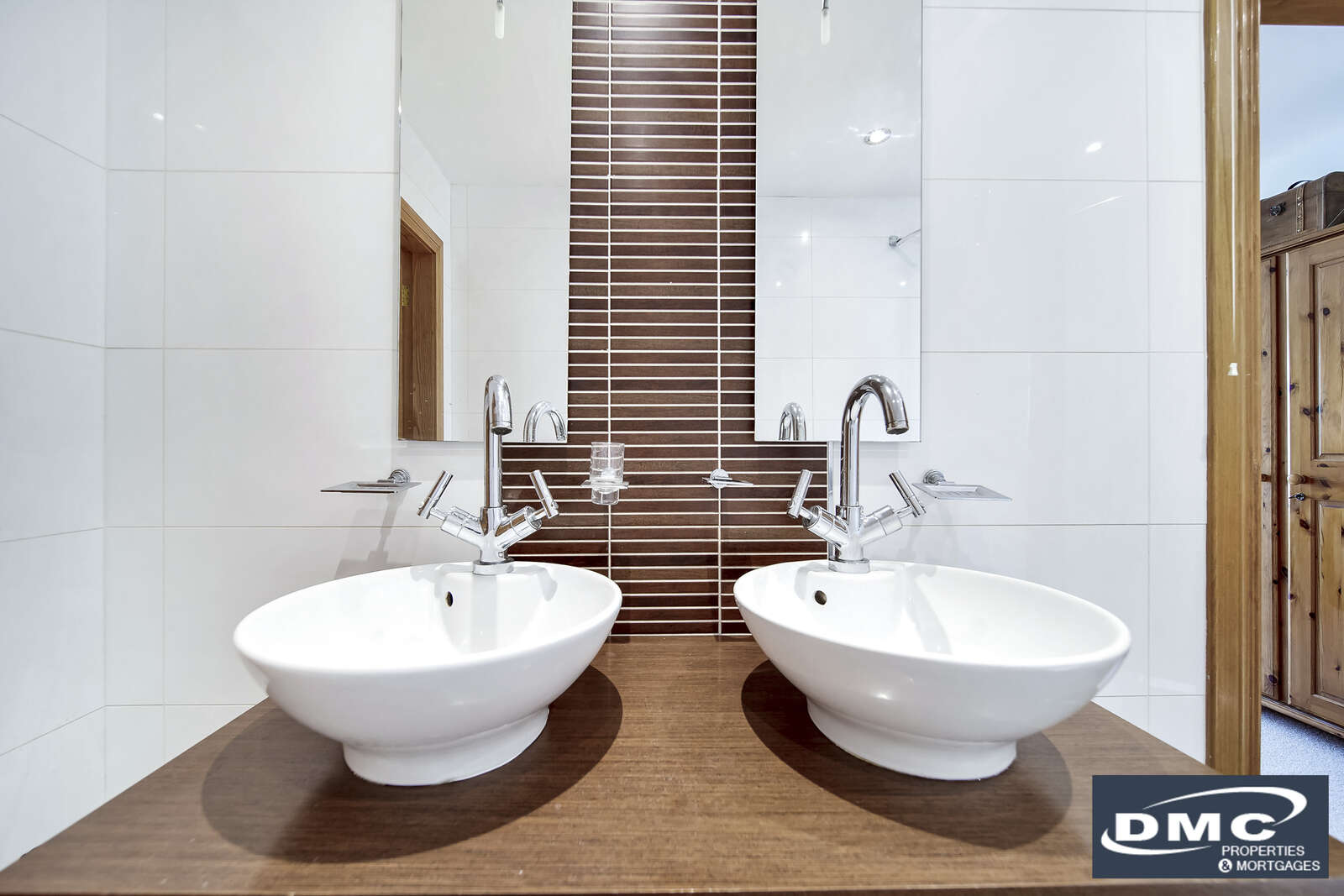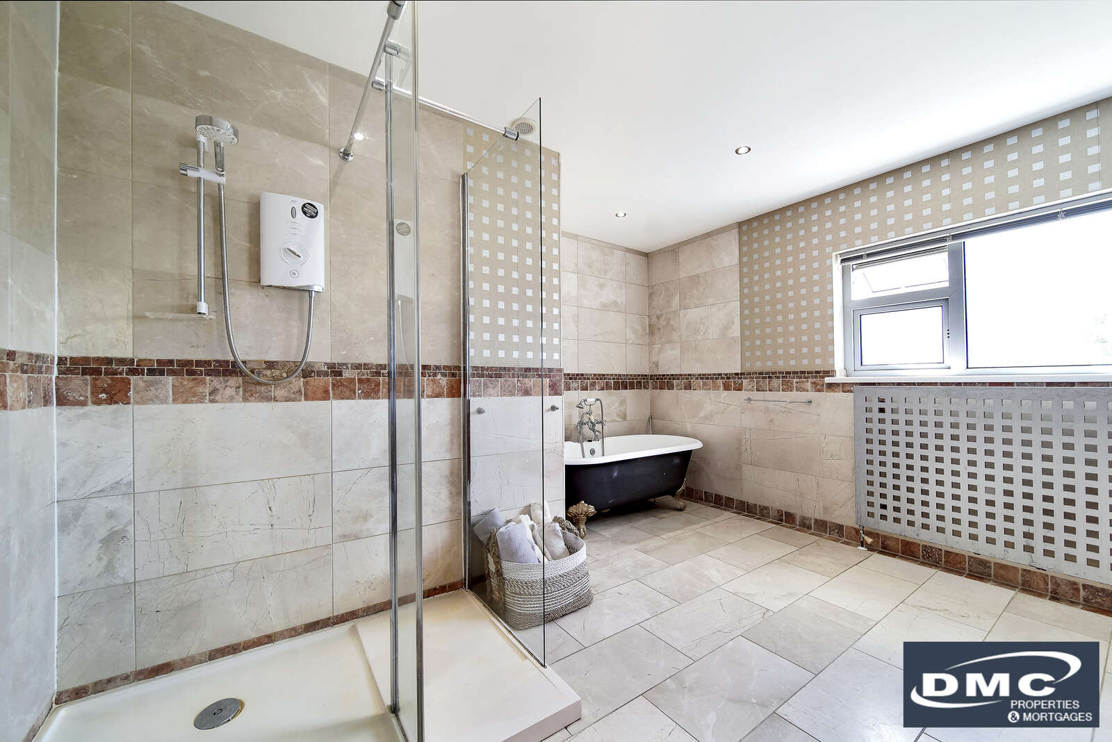 Bathroom :12'0 x 11'2 Deluxe white five piece suite comprising feature free standing bath with telephone taps and shower attachment. Oak vanity unit with marble worktop housing twin wash hand basin with wall mirrors. Low flush w.c. Large walk in shower unit with drying area and Mira Sport electric shower. Good quality tiling to walls and floor. Recessed lights to ceiling. Feature radiator.
