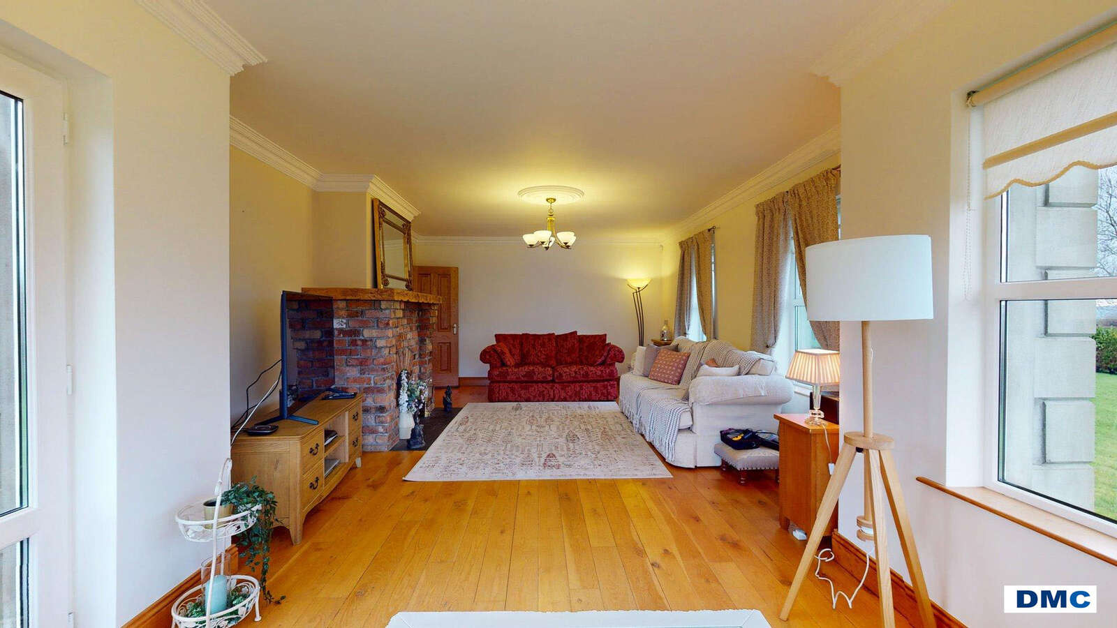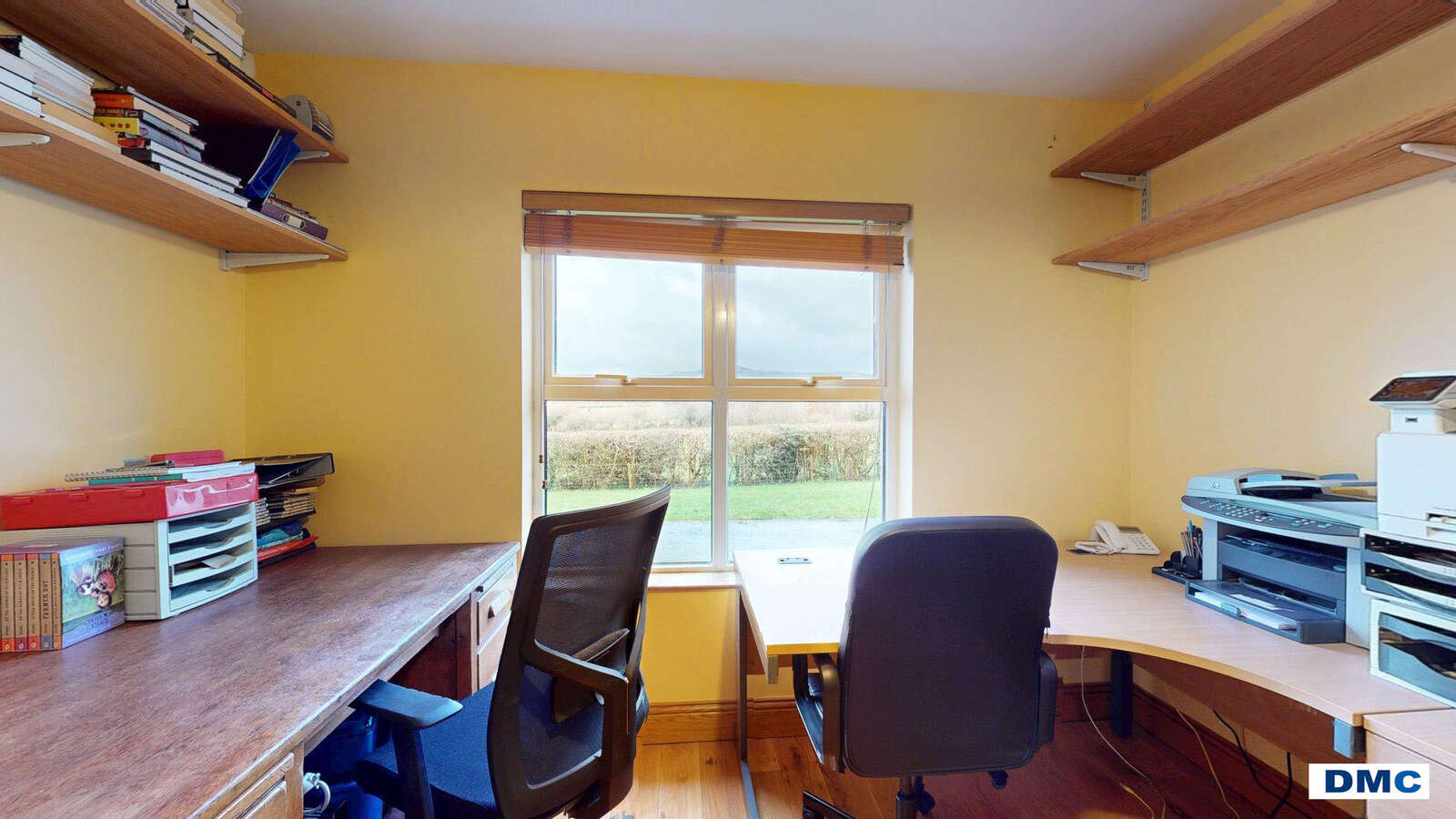 The property occupies a spacious site approached by a private laneway off the main Gelvin Road. The gardens are laid out in lawns to the front, side and rear of the dwelling house enclosed by fencing, gates and mature hedgerows. Tarmac driveway with excellent parking space to front and side of dwelling leading to large Detached Garage. Outside lights and water tap. Oil fired boiler. PVC oil tank. Covered Lean-to Wood Sore/Dog compound. Septic tank sewage system.