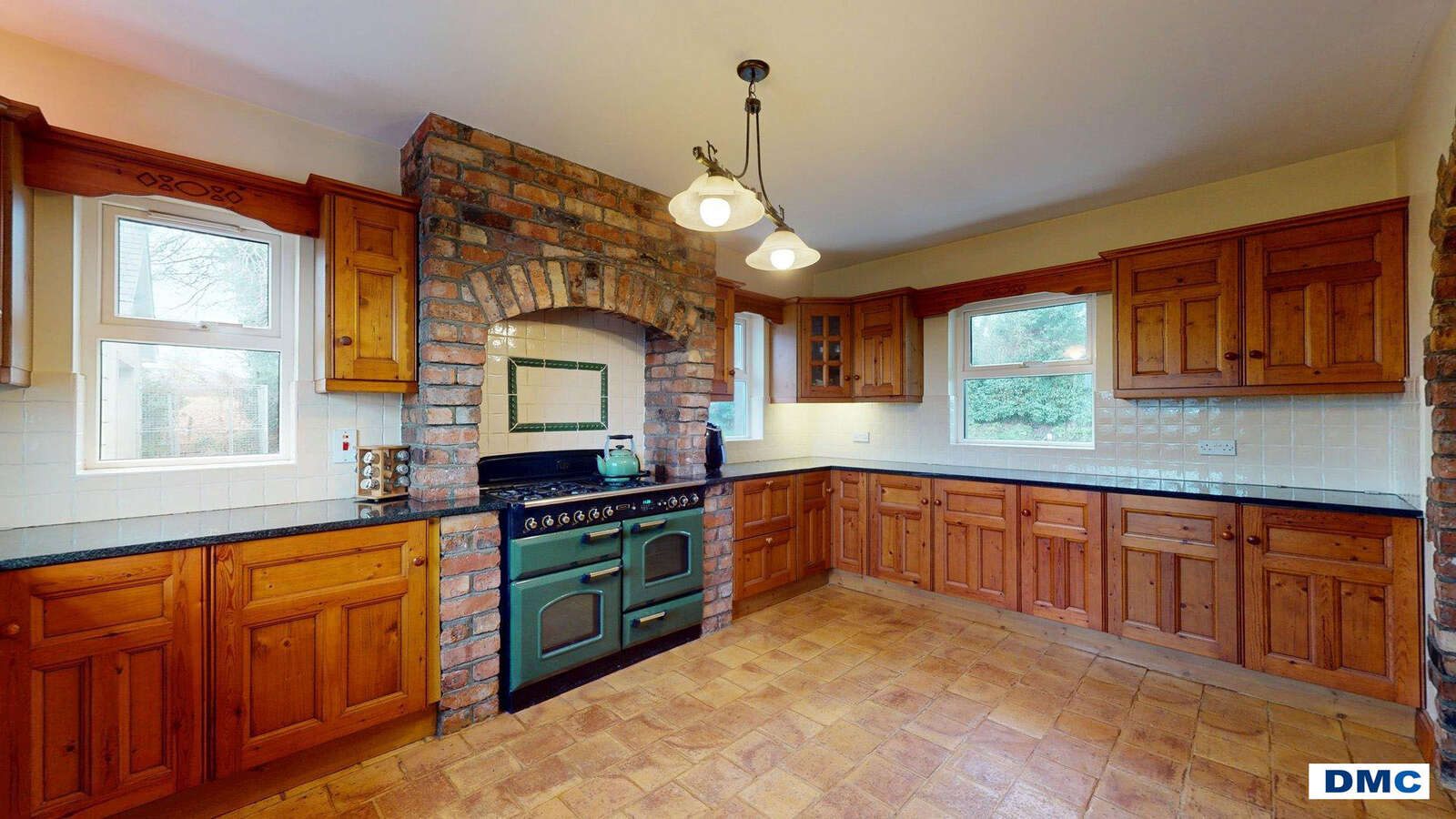15'10 x 10'6 Excellent range of Antique Pine units with granite worktops and drainer. Stainless steel one and a quarter bowl sink unit with chrome mixer taps. Part tiled walls. Terracotta tiled floor. Corner display unit, winerack and window pelmet. Feature Inglenook fireplace housing LEISURE rangemaster cooker with electric ovens and gas hob. Concealed extractor fan. High ceiling.