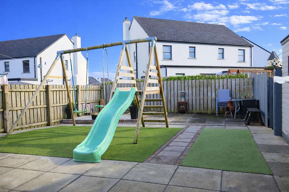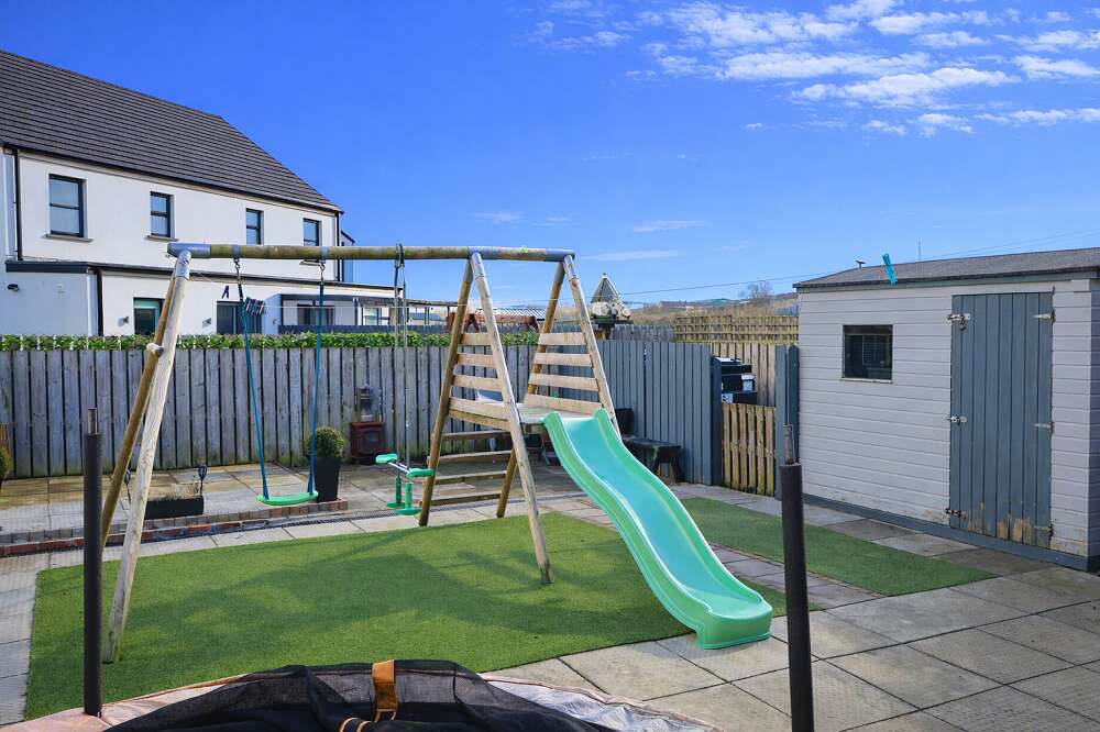 Small front garden laid out in lawns with tarmac driveway to side of dwelling leading to enclosed rear garden with garage space. Paved rear garden with artificial grass areas enclosed by timber fencing and gates. Oil fired boiler. PVC oil tank. Outside lights and water tap. Garden Shed.