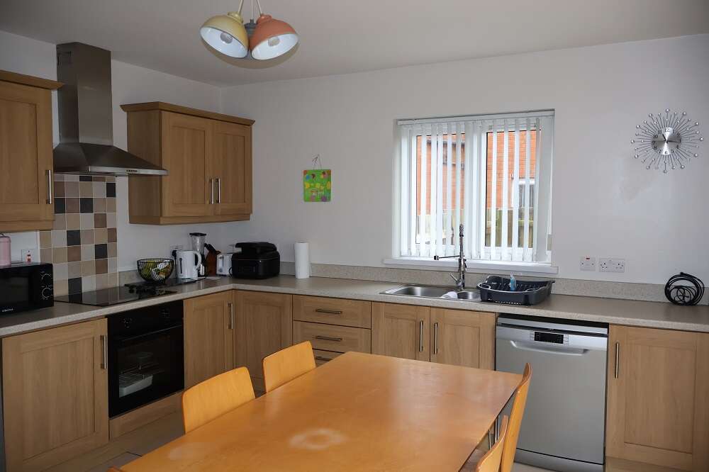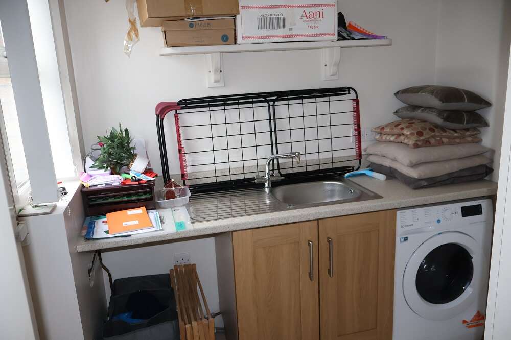 6'4 x 5'2 Light Oak Shaker Base units with matching worktops and splashbacks. Stainless steel sink unit and single drainer with mixer taps. Plumbed for washing machine. Ducted for tumble dryer. Tiled floor with matt finish. uPVC rear door with double glazed centre light.