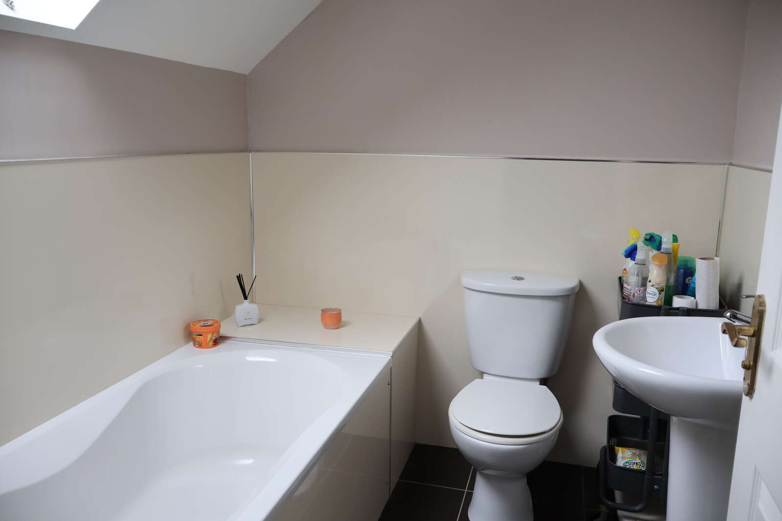 6'8 x 5'8 White modern 3 piece suite comprising large bath with mixer taps and shower attachment. Pedestal wash hand basin. Low flush w.c. Vinyl wall panelling. Tiled floor. Chrome heated towel rail.