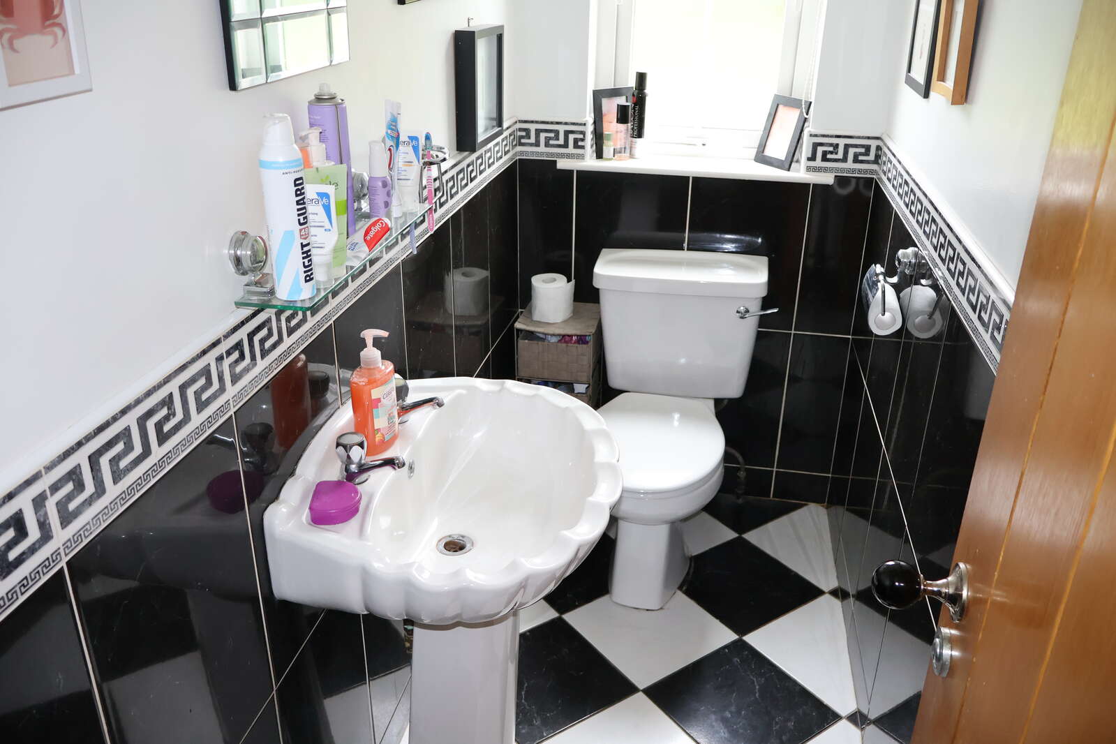 7'6 x 2'10 White 2 Piece suite company. Pedestal wash hand basin and low flush w.c. Half tiled walls. Tiled floor.