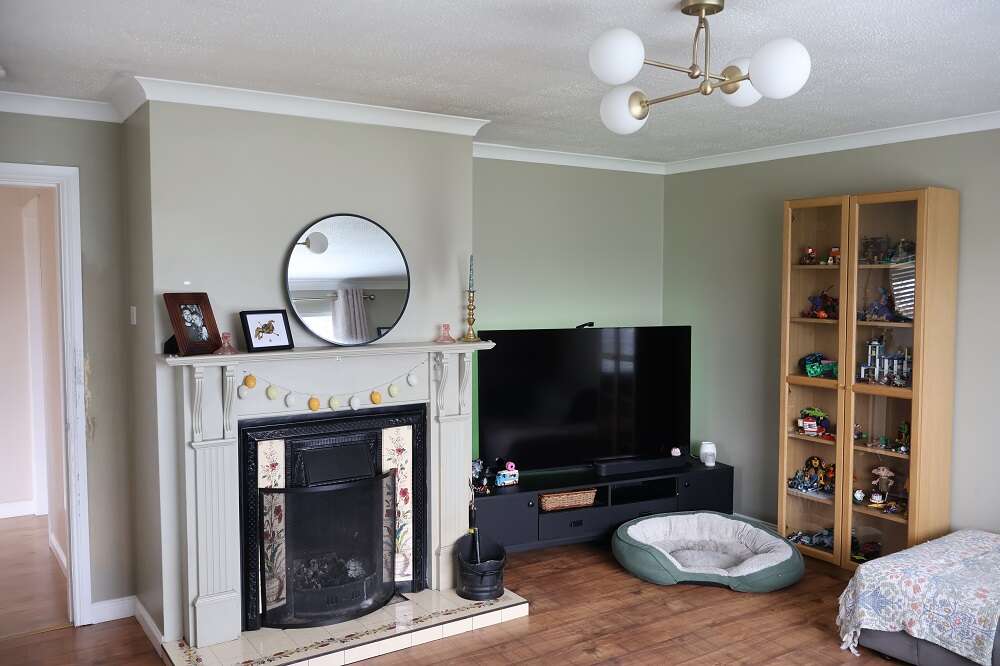 14'8 x 14'6 Feature cast iron fireplace with tiled inset, open fire with back boiler and contemporary surround. Ceiling cornicing. Walnut flooring.