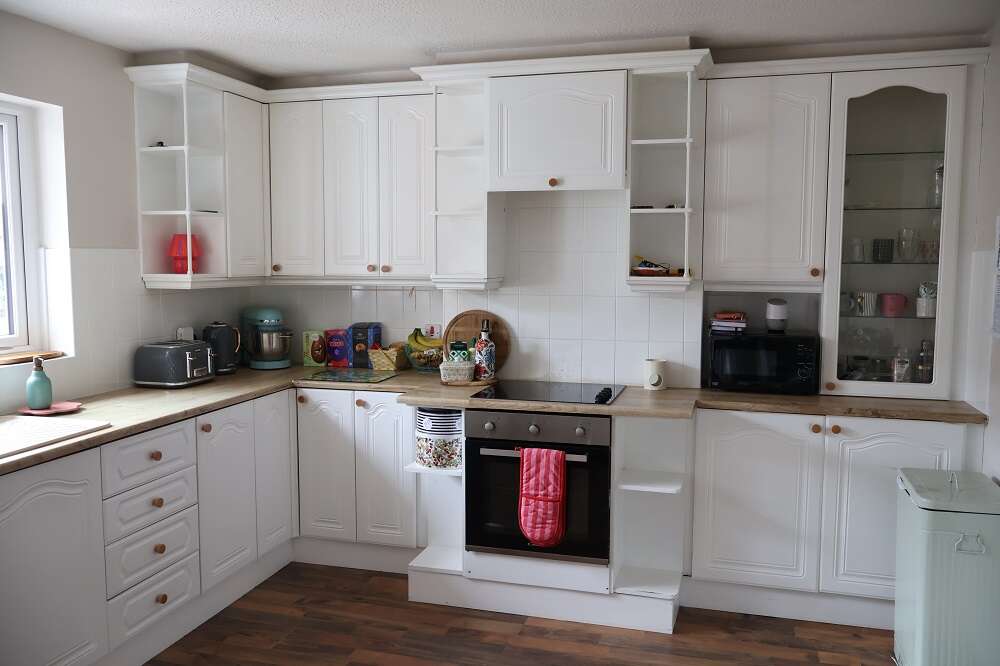 14'4 x 12'8 Good range of Handpainted units with matching worktops. Ceramic one and a quarter bowl sink unit and drainer with mixer taps. Part tiled walls. Walnut flooring. Plumbed for dishwasher. Display unit and corner shelving. CANDY underoven and IGNIS 4 Ring ceramic hob with concealed extractor fan.