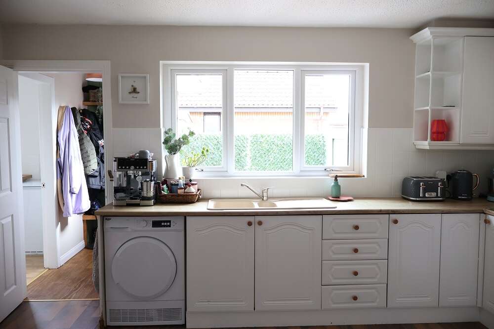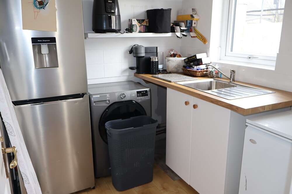 7'4 x 6'6 Built in base unit with matching worktops. Stainless steel sink unit and single drainer with chrome mixer taps. Part tiled walls. Light Oak floor. Open shelving. GRANT oil fired boiler.