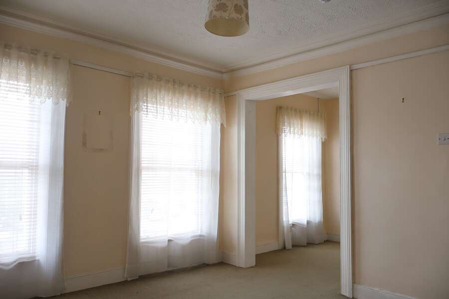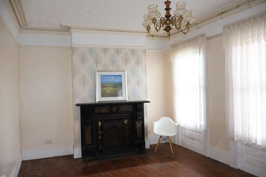 Living Room :20'0 x 12'6 Original cast iron fireplace with tiled inset and slate surround. Redwood floor. Ornate ceiling cornicing.