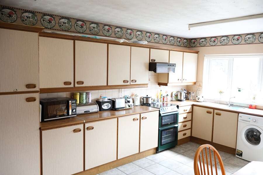 16'6 x 10'4 Good range of built in units with matching worktops. Stainless steel one and a quarter bowl sink unit and drainer with chrome mixer taps. Part tiled walls. Tiled floor. Plumbed for washing machine. CREDA free-standing cooker and ZANUSSI extractor fan. uPVC rear door with double glazed centre light.