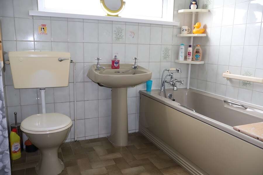 6'8 x 6'8 Coloured 4 piece suite comprising bath with telephone taps and shower attachment. Pedestal wash hand basin. Low flush w.c. Separate walk-in shower unit with Gainsborough electric shower. Tiled walls and floor.
