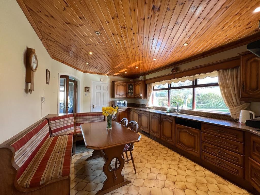 Having range of eye and low level units, glazed display cupboards, granite worktop and splashback, hob, double oven, extractor canopy, integrated dishwasher, dining space, recessed ceiling lighting, tiled floor.