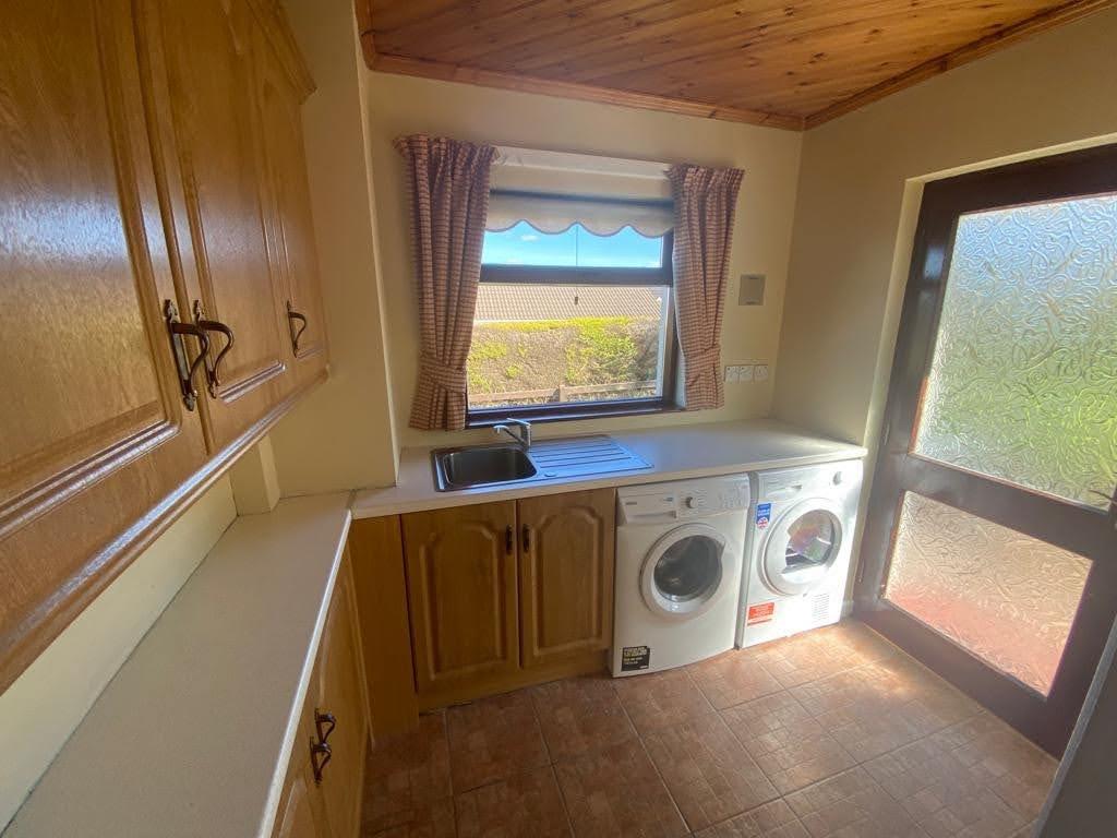 Having eye and low level units, single drainer stainless steel sink unit with mixer taps, plumbed for washing machine, space for tumble dryer, tiled floor.
