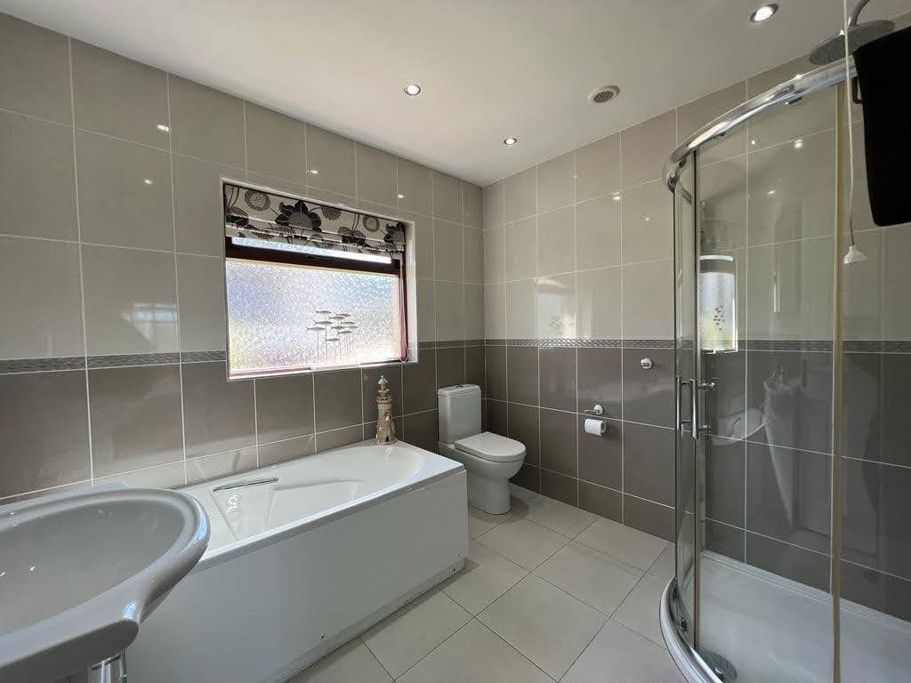 Comprising bath with shower fitting to taps, walk in shower, whb set in vanity unit, wc, recessed lighting, tiled walls and floor.