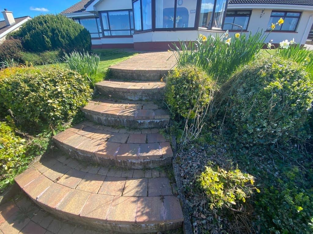 Paved paths leading to extensive driveway.