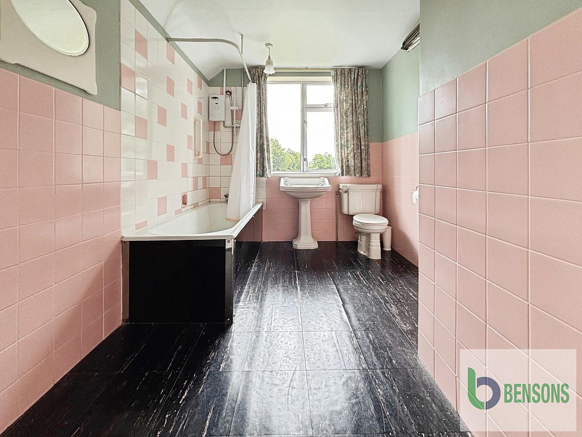With bath with shower over, wc, wash hand basin, storage into eaves and part tiled walls.