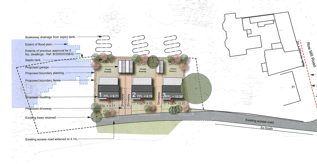 Proposed Site for 3 No. detached dwellings with garages, installation of septic tanks and soakaways and all associated works.
