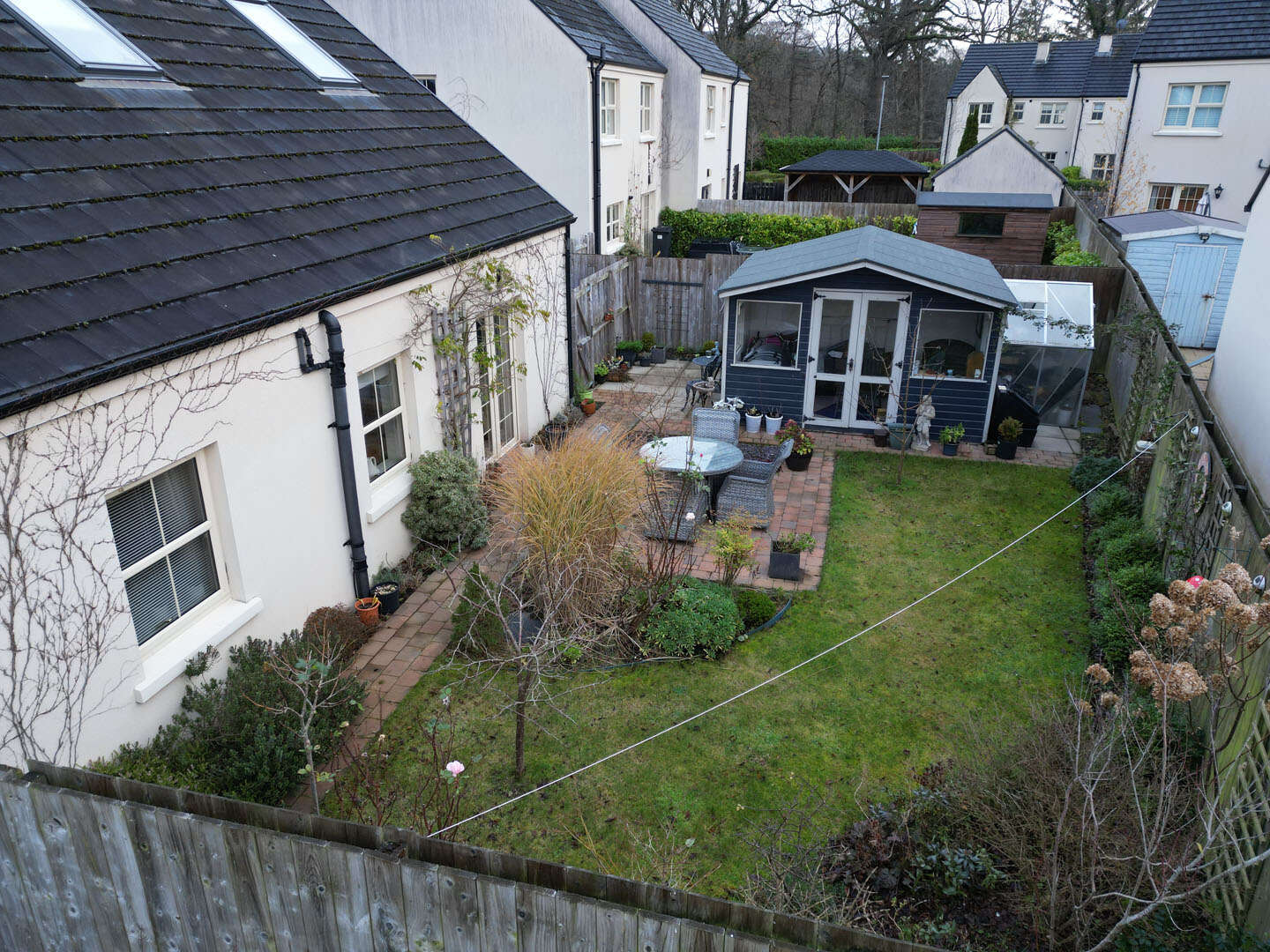 Excellent corner site with gardens to front, side and rear of dwelling laid out in lawns, plants, shrubs and trees enclosed by mature laurel hedge and railings. Tarmac driveway to side of property with garage space to rear. Paved patio area to south facing rear garden. Summer House and Garden Shed. Outside lights and water tap.