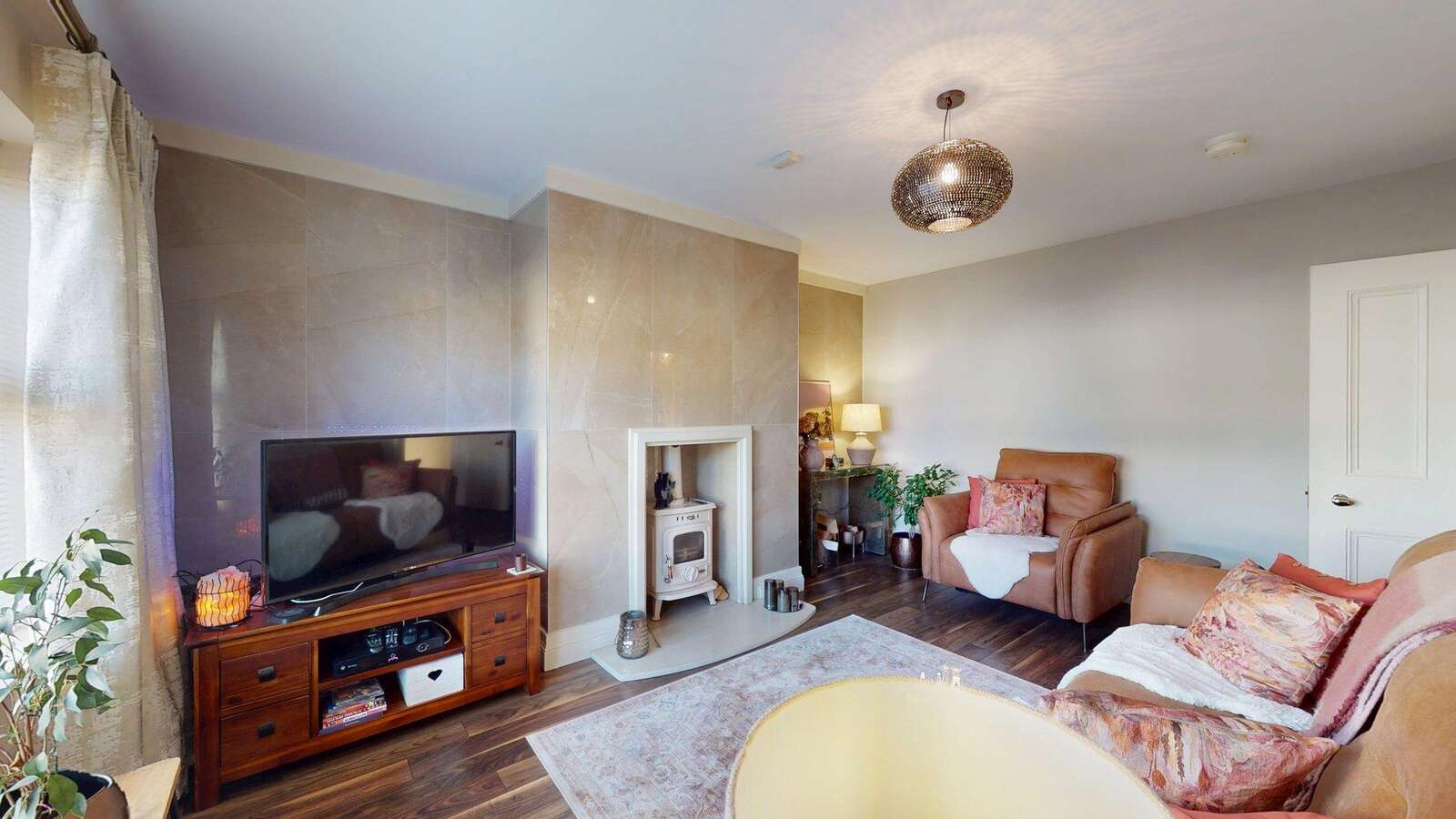 Living Room :15'10 x 12'4 Feature hole-in-wall fireplace housing HENLY 6KW multifuel Stove with granite hearth. Walnut floor.