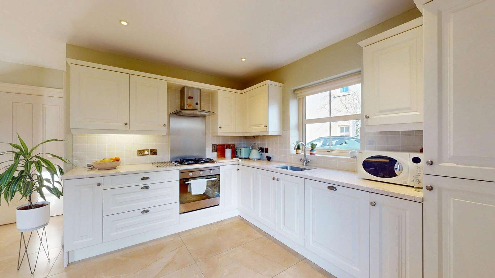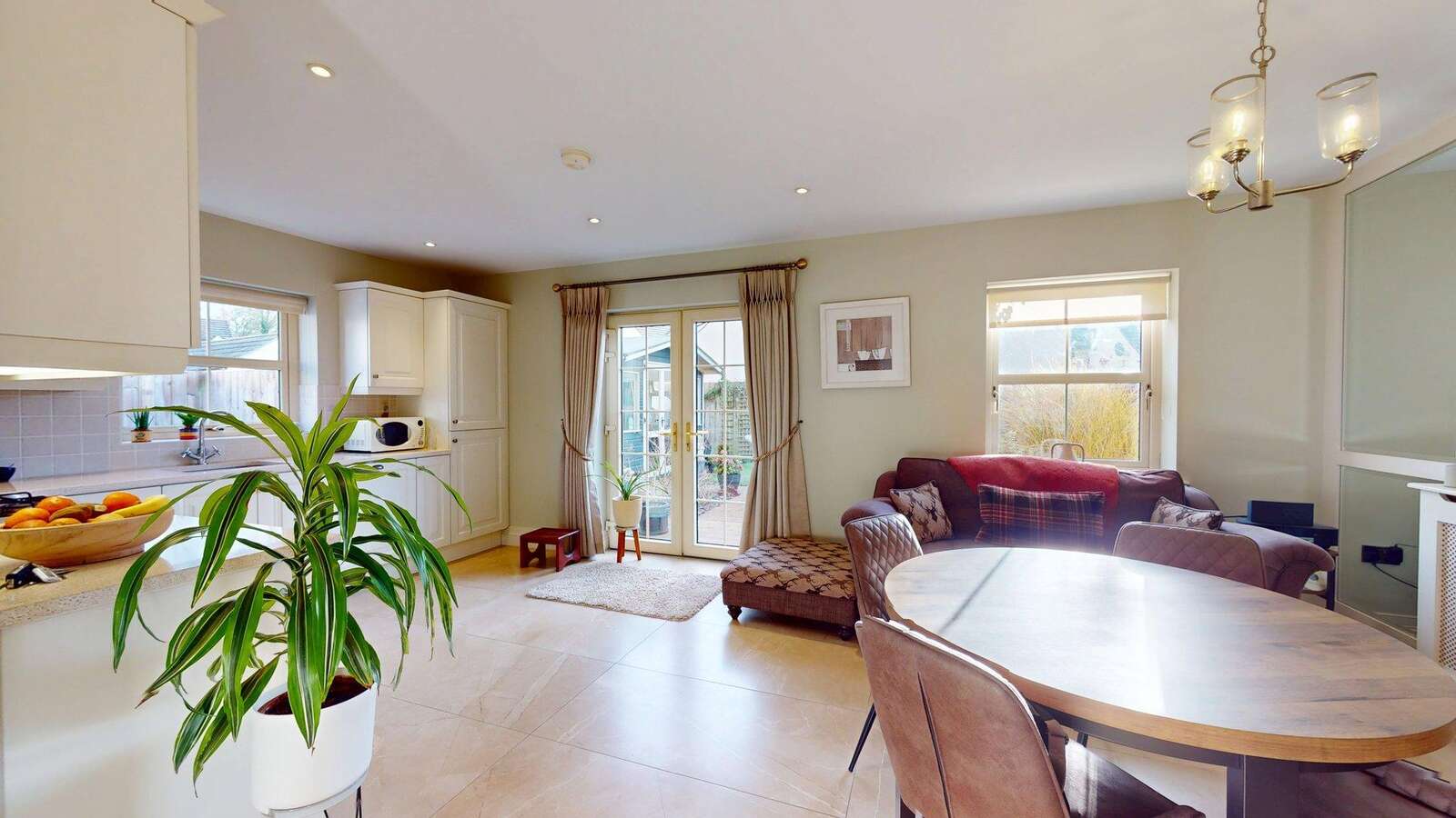 Kitchen/Dining Area With Living Space :20'2 x 11'10 Superb range of Contemporary Shaker style units Quartz worktops and drainer. Stainless steel sink unit with chrome mixer taps. Part tiled walls. Porcelain tiled floor. Recessed lights to ceiling. Walk-In Cloakroom. Integral fridge/freezer. HOTPOINT integral dishwasher. INDESIT Electric underoven and 4 ring gas hob with feature stainless steel splashback and canopy housing concealed extractor fan. uPVC french doors leading out into south facing rear garden. Feature wall to dining area with radiator cover.