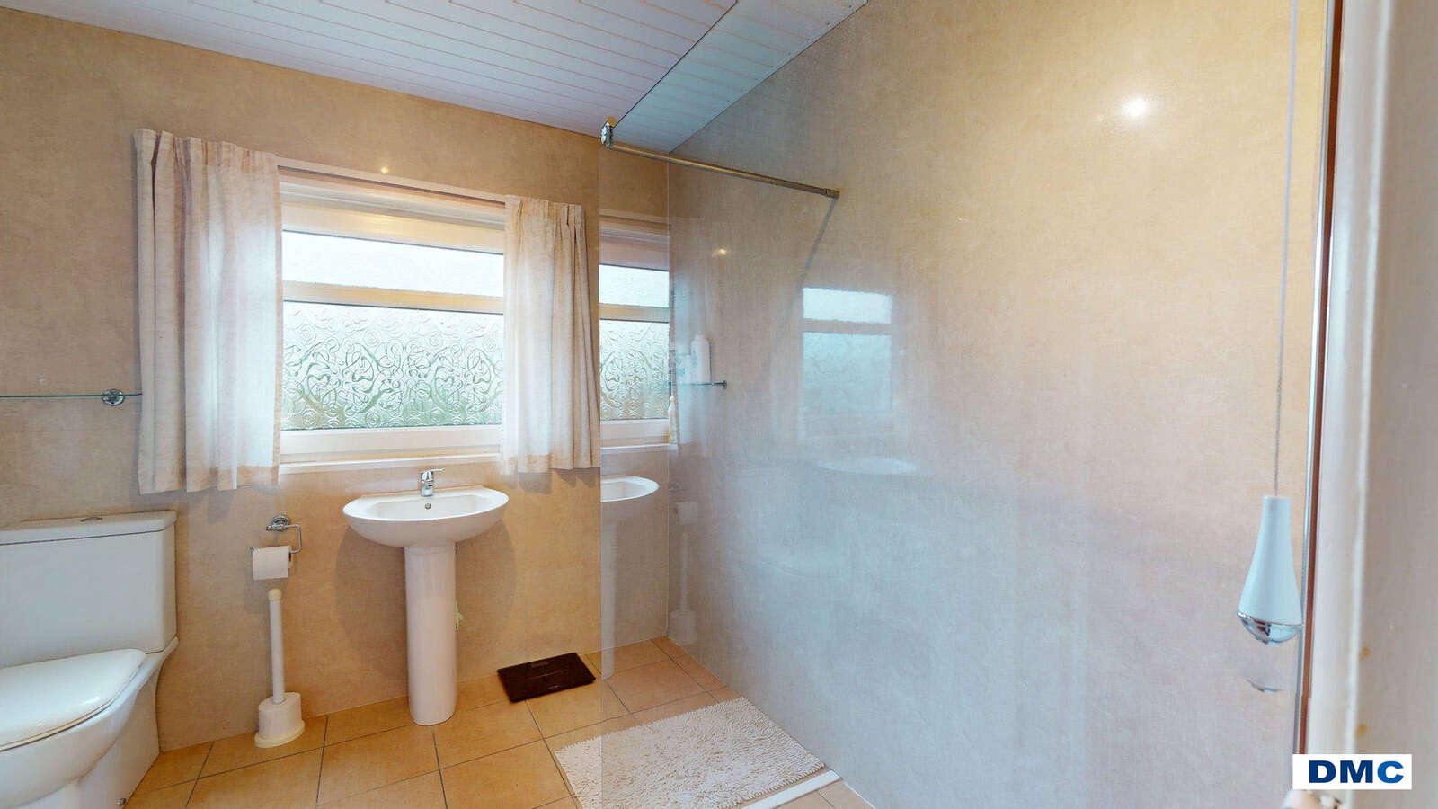 8'4 6'8 White, modern suite comprising large shower area with thermostatic power shower. Pedestal wash hand basin and low flush w.c. Vinyl wall and ceiling covering. Tiled floor. Shelved Hotpress with willis type immersion heater.