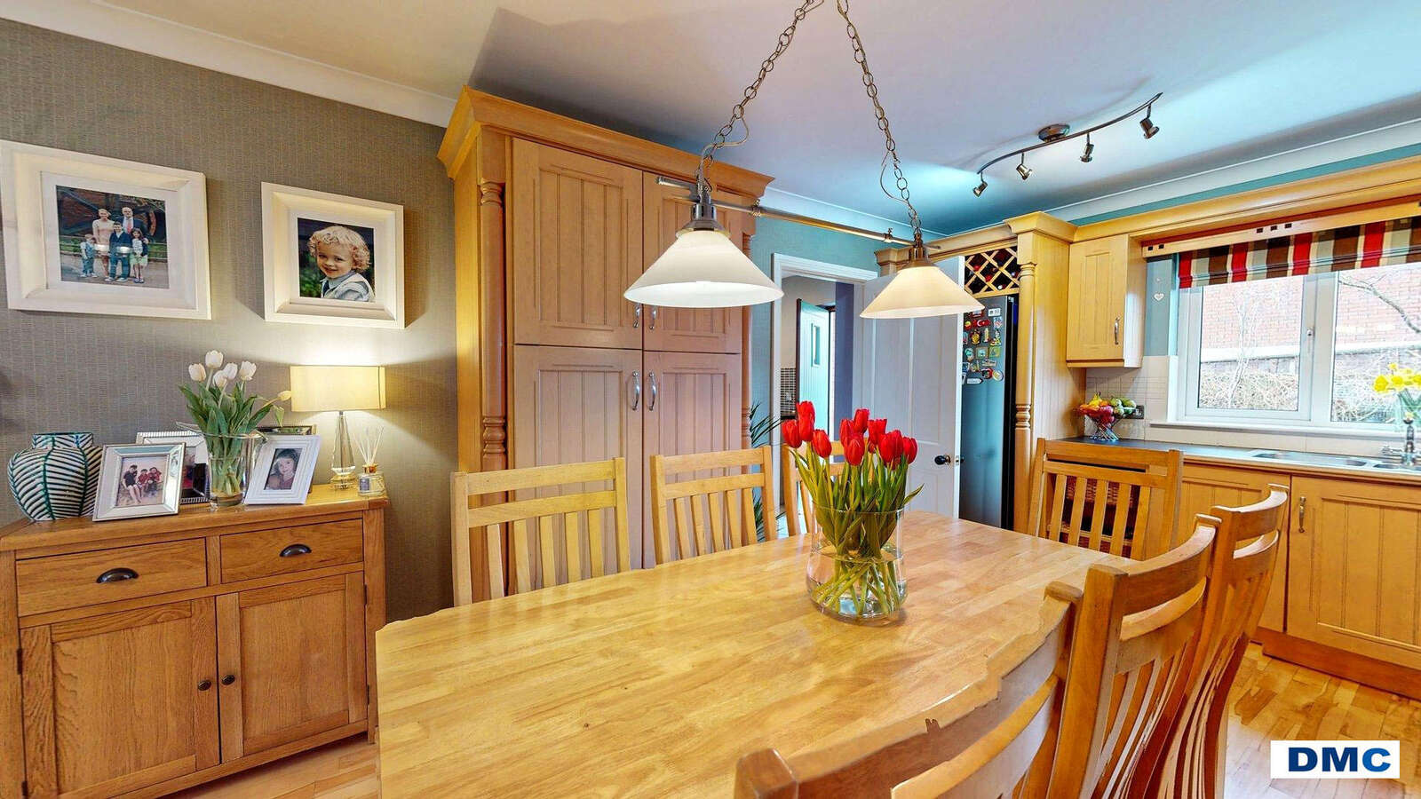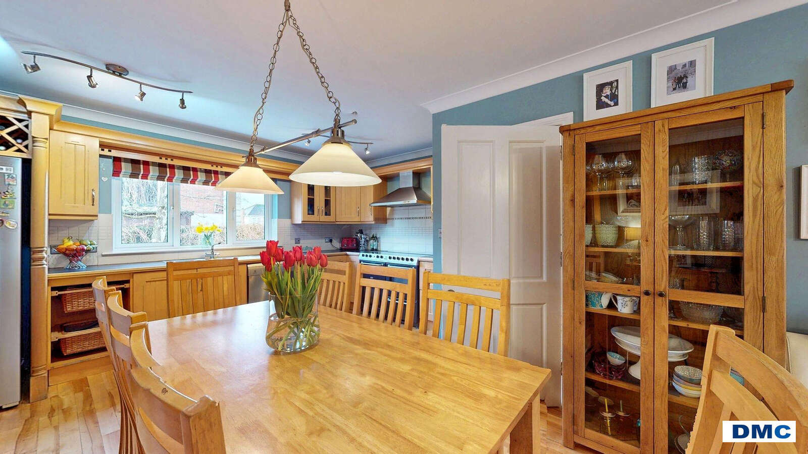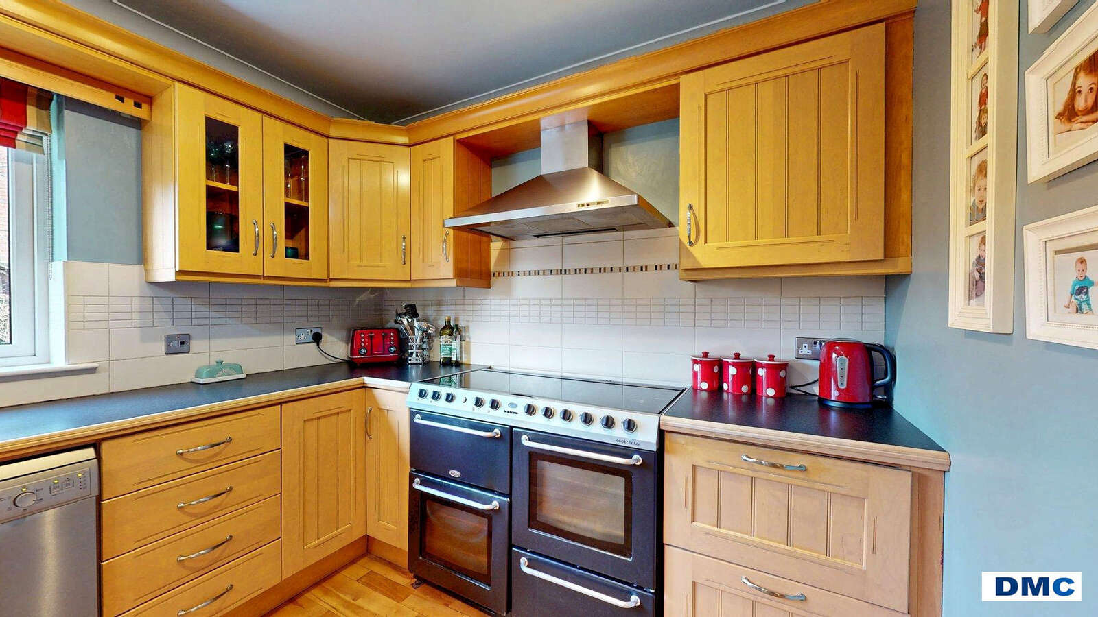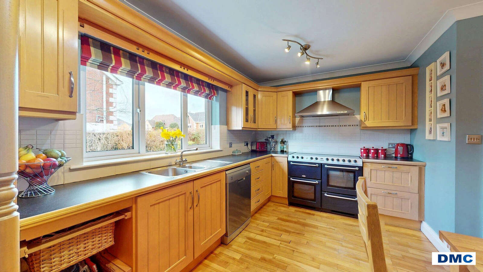 26'0 x 13'2 Excellent range of Maple Shaker style units with matching worktops. Stainless steel one and a quarter bow sink unit and drainer with chrome mixer taps. Modern tiling to walls. Canadian Maple floor. Display units and window pelmet, winerack, vegetable larder unit. Electrolux dishwasher. MIDEA American style fridge/freezer. BELLING range cooker with stainless steel canopy housing