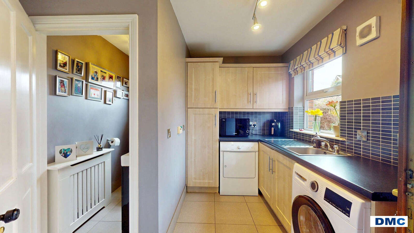 11'6 x 7'6 Good range of Maple Shaker style units with matching worktops. Stainless steel sink unit and single drainer with chrome mixer taps. Part tiled walls and tiled floor with splashback tiles. Plumbed for washing machine. Ducted for tumble dryer. Hardwood rear door with double glazed centre light.