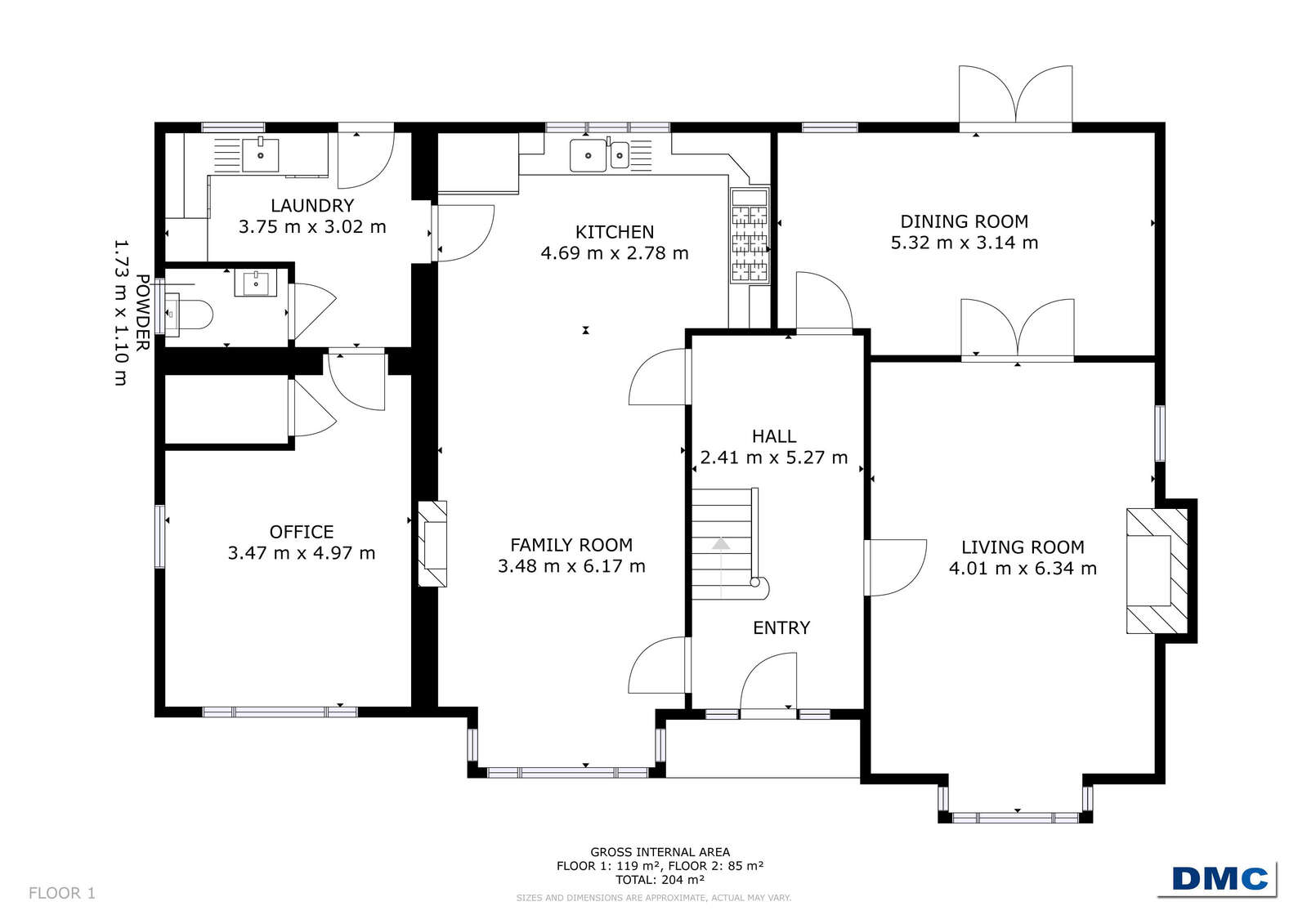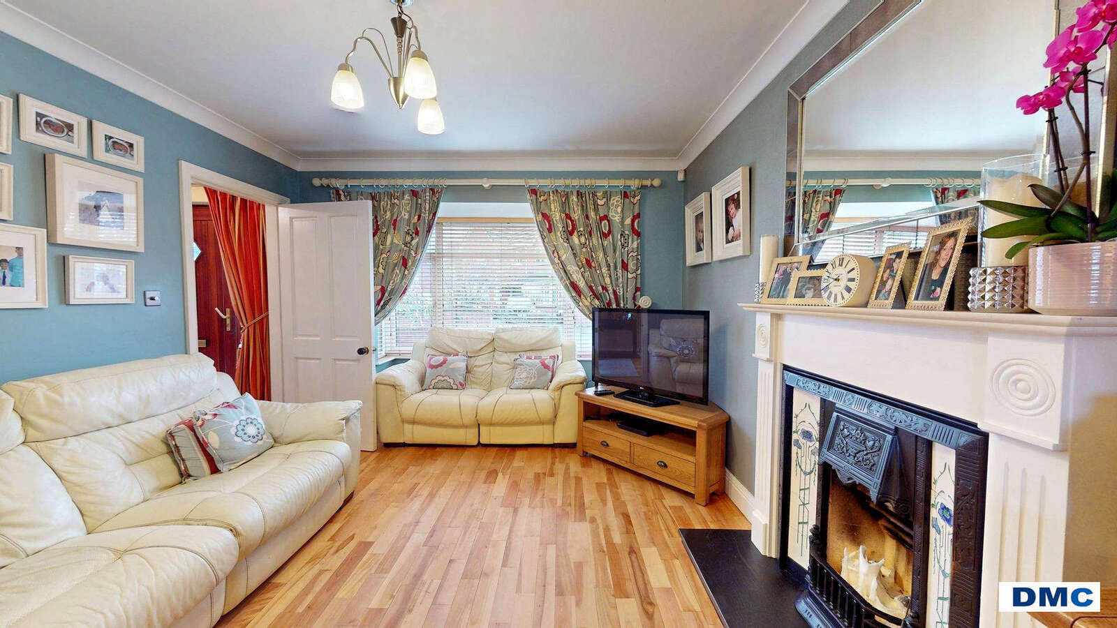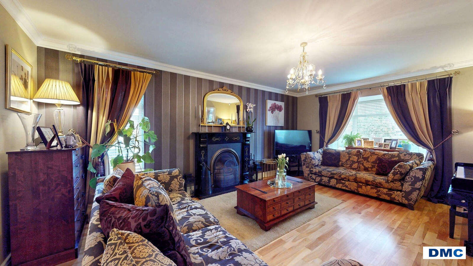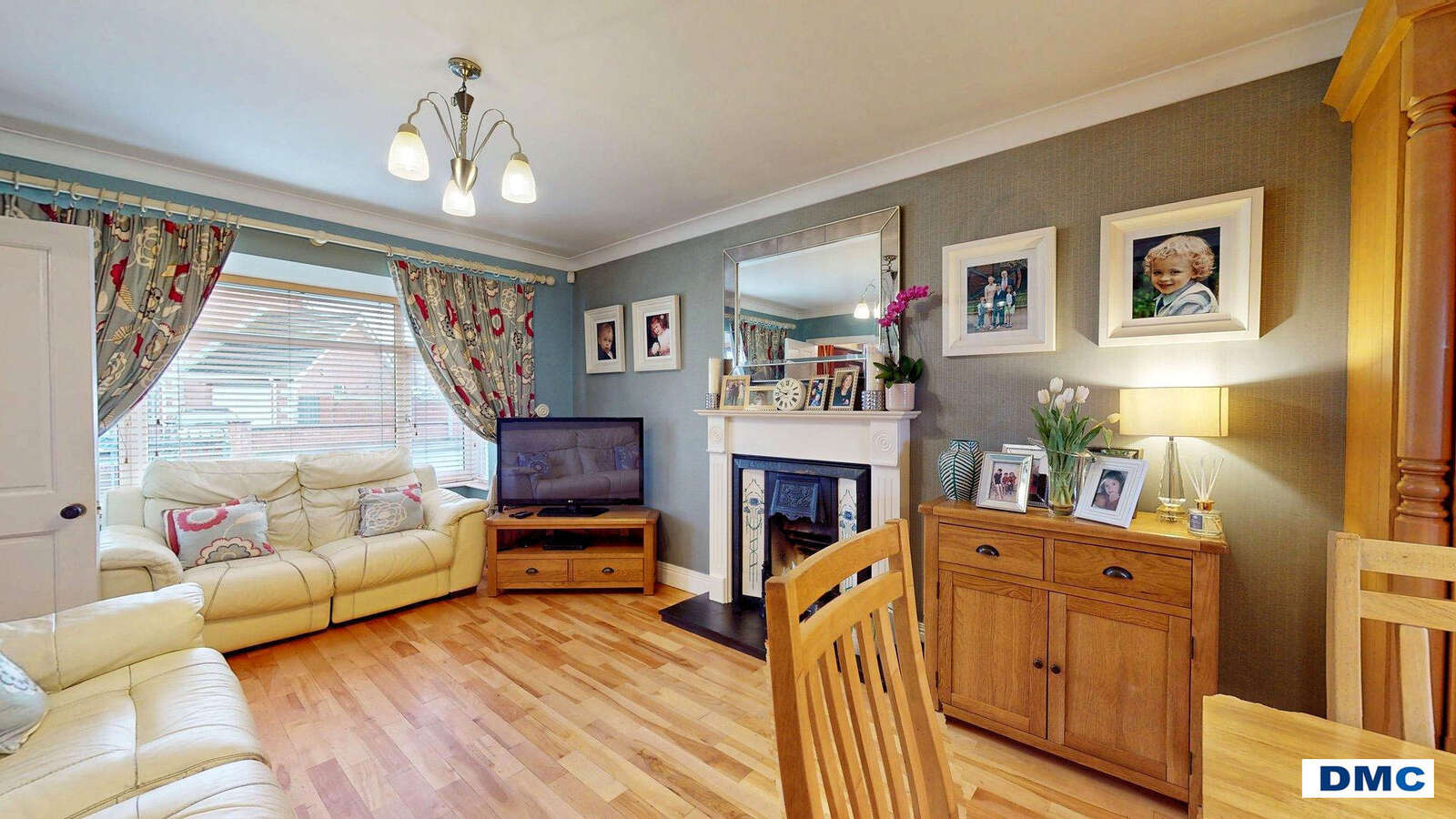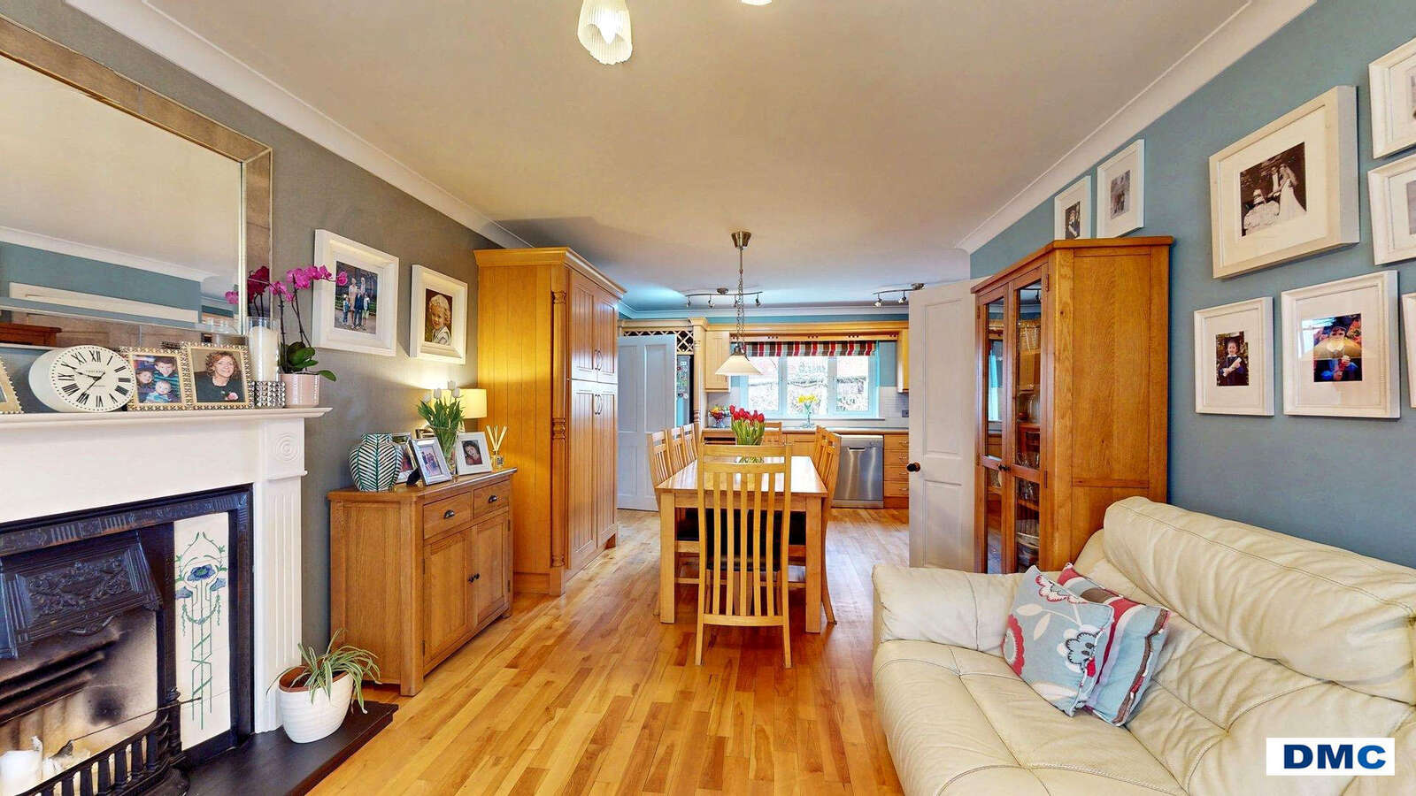 concealed extractor fan. Family Room with feature cast iron fireplace, large bay window and ceiling cornicing.