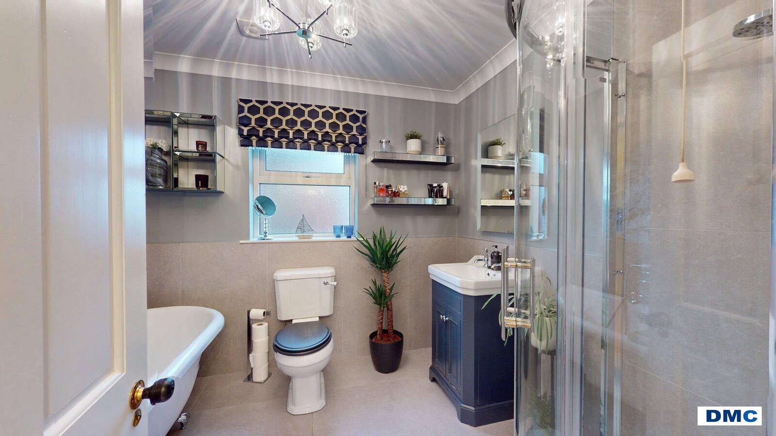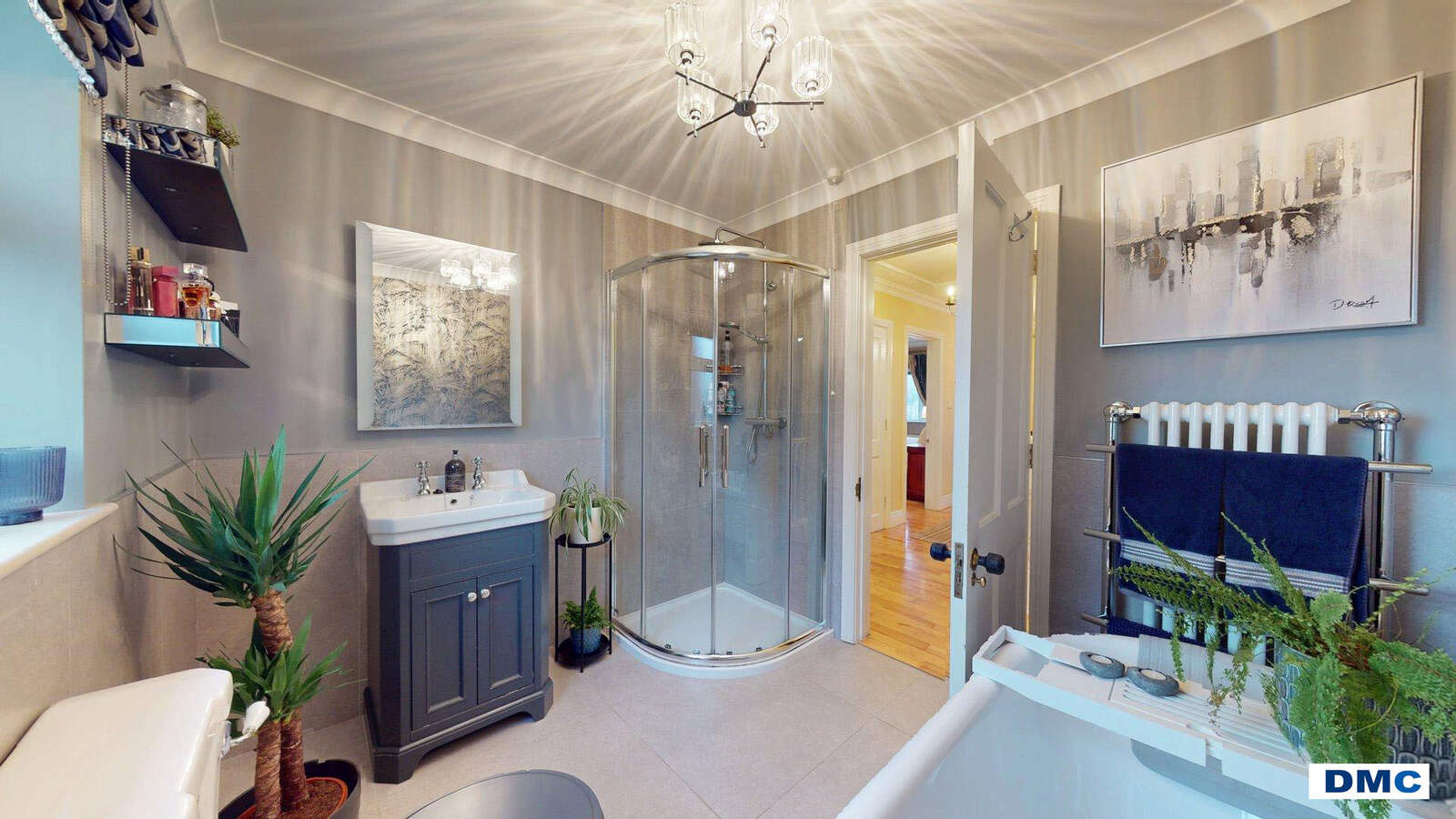 8'10 x 7'8 White 'Vintage' 4 Piece suite comprising large free standing bath with telephone taps and shower attachment. Feature vanity unit with wash hand basin. Low flush w.c. Large corner shower unit with overhead rain shower. Feature tiling to walls and floor. Heated towel rail. LED wall mirror. Ceiling cornicing.