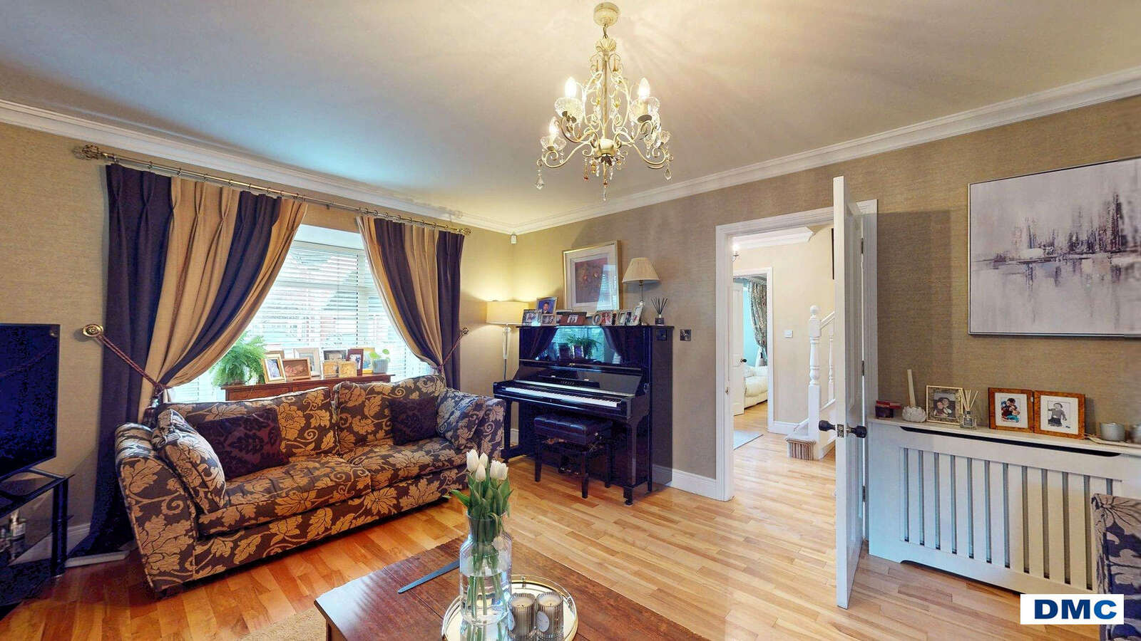 16'10 x 7'6 Hardwood front door with double glazed centre light and side screen Canadian Maple floor. Ceiling cornicing. Contemporary staircase leading to Gallery Landing.