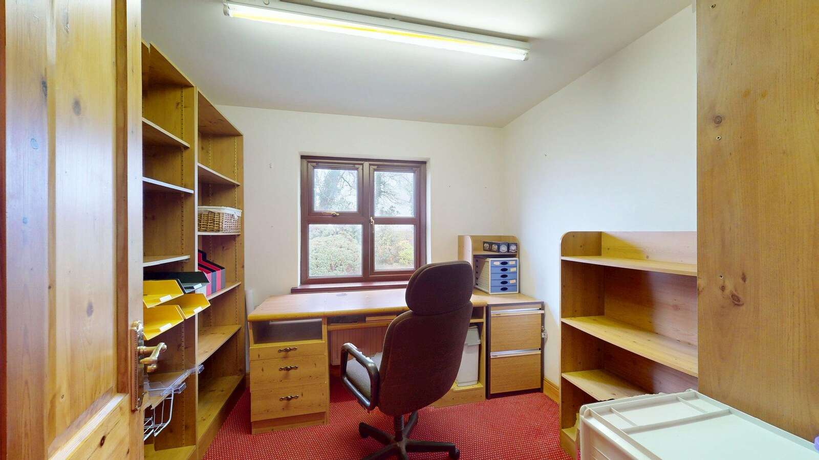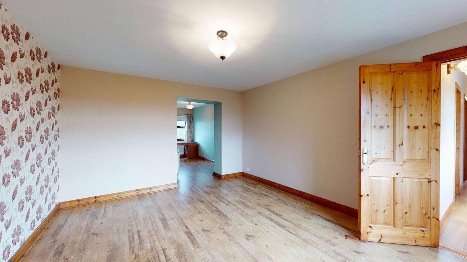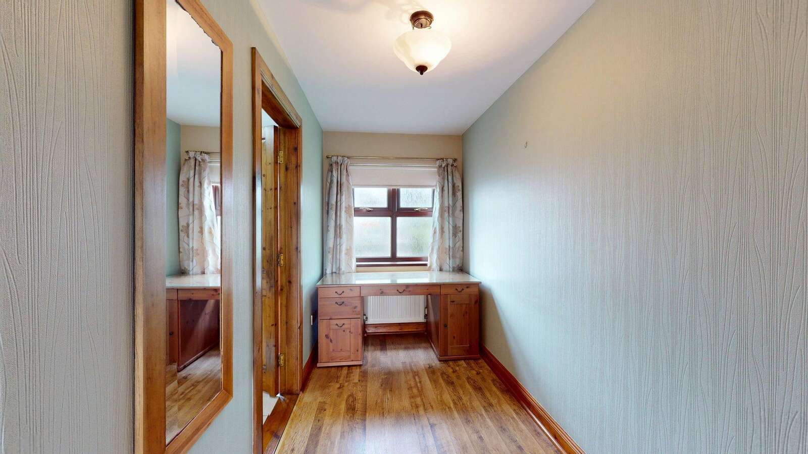 Glass panelled vestibule door with side screen. Honey Oak floor. Shelved Hotpress with willis type immersion heater.