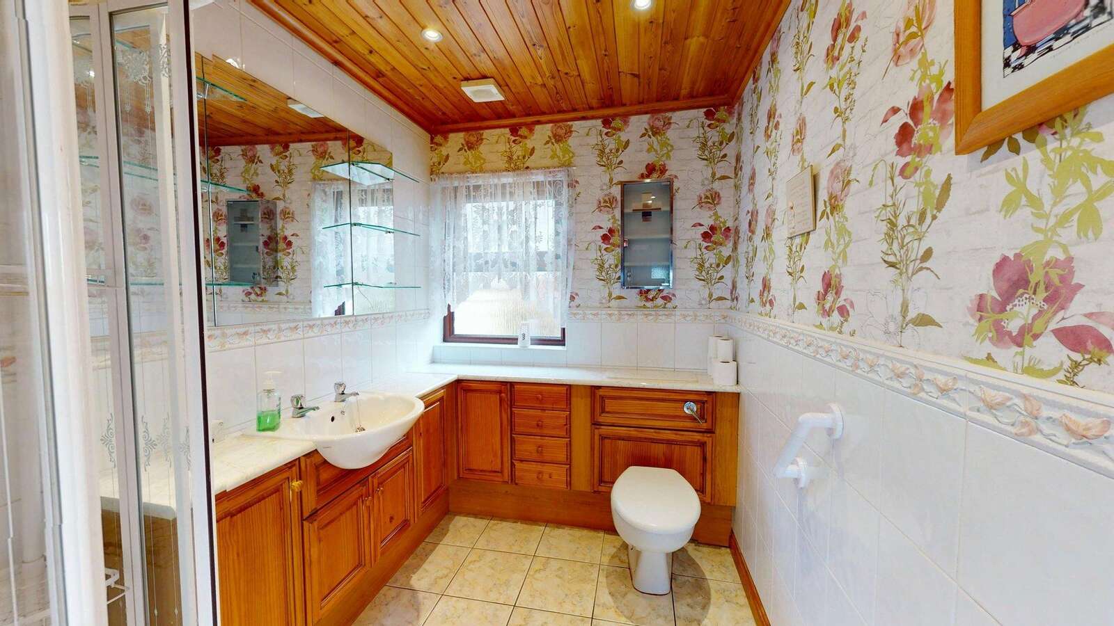 8'4 x 5'6 White 3 Piece suite comprising large corner shower unit with REDRING PLUS Electric shower. Vanity unit with wash hand basin. Low flush w.c. Redwood storage lockers and drawer sets. Wall mirror with display shelved. Half tiled walls. Tiled floor. Redwood ceiling with recessed lights.