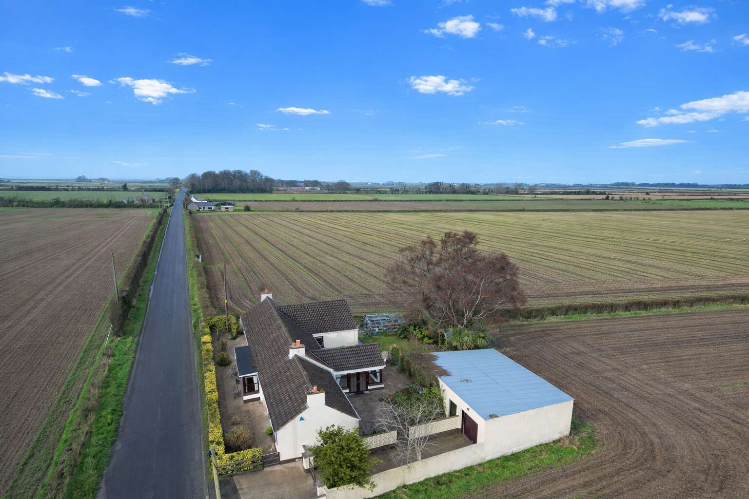 Mature, landscaped gardens to front, side and rear of dwelling laid out in lawns, plants, shrubs and trees enclosed by fencing, wall and gates. Concrete driveway leading to Detached Garage. Patio area to rear garden. Outside lights and water tap. Greenhouse and wash house. Oil fired condensing boiler. PVC oil tank. Septic tank.