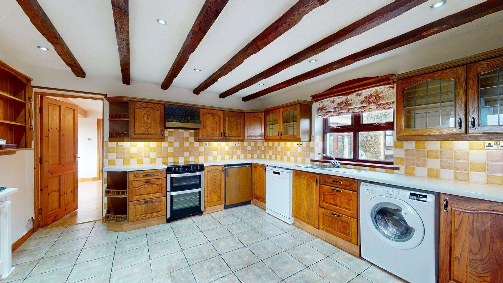 12'6 x 12'6 Excellent range of Chestnut units with matching worktops. Stainless steel sink unit and single drainer with chrome mixer taps. Part tiled walls. Tiled floor. Exposed timber beams to ceiling with recessed lights. Display units and window pelmet. Radiator cover. Plumbed for washing machine. Plumbed for dishwasher. Canopy housing concealed extractor fan.