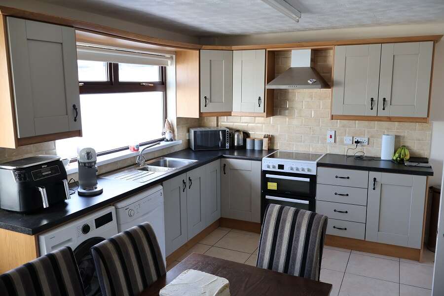 13'6 x 11'10 Excellent range of Contemporary Shaker style units with matching worktops. Stainless steel one and a quarter bowl sink unit and drainer with chrome mixer taps. Part tiled walls. Tiled floor. Understairs Cloakroom. Window pelmet. SAMSUNG washing machine. BEKO dishwasher. Free standing Cooker. Stainless steel canopy housing concealed extractor fan. uPVC rear door.