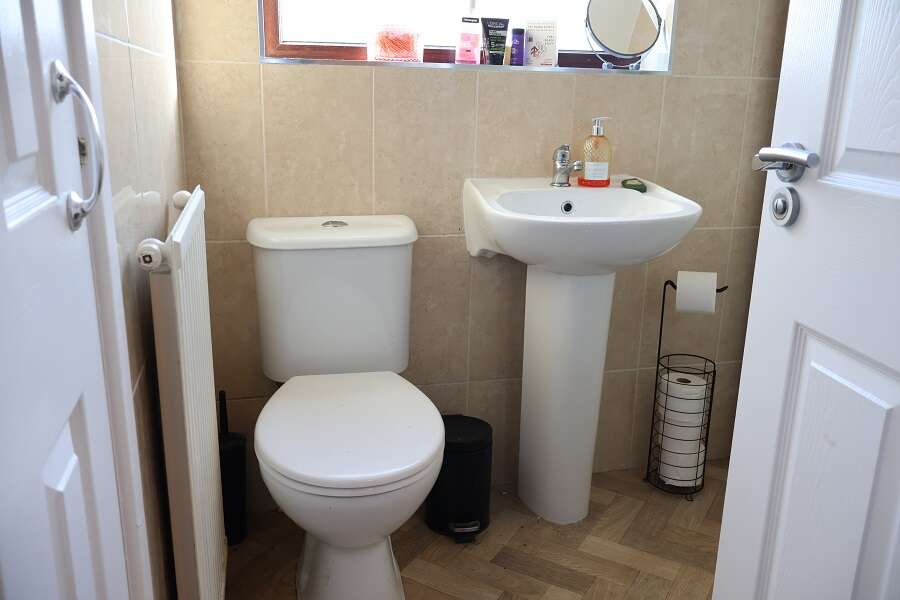 5'8 x 5'6 White 3 Piece suite comprising corner shower unit with REDRING Electric shower. Pedestal wash hand basin. Low flush w.c. Tiled walls. Vinyl floor covering. Shelved Hotpress.