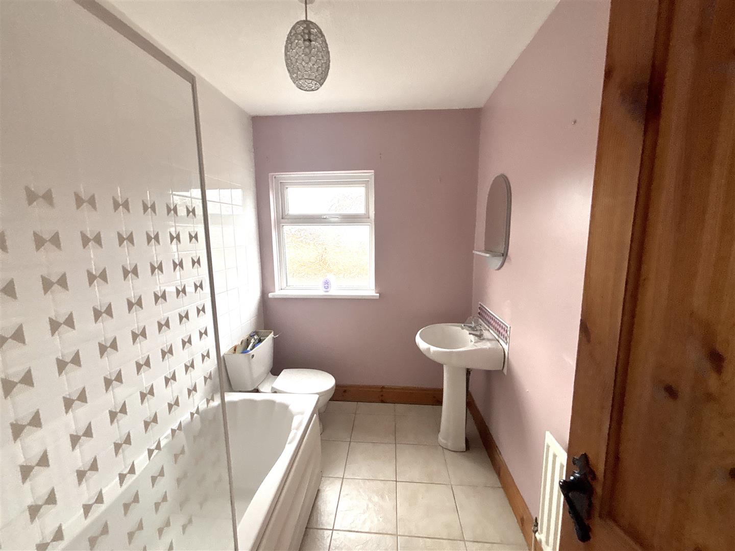 Fitted with a white bath, pedestal wash hand basin and Low Flush W.C. Electric shower over bath. Tiled flooring. Part tiled walls.