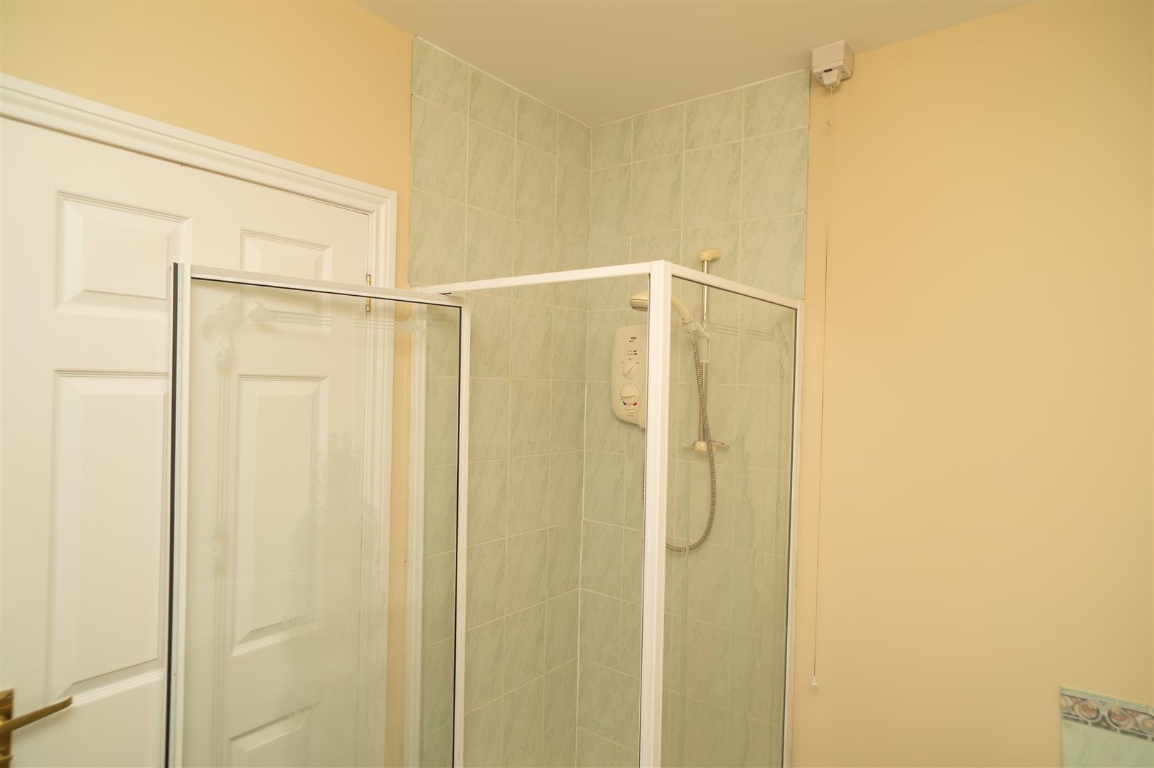 Low Flush WC, Pedestal wash hand basin, Fully tiled shower cubicle with electric shower.