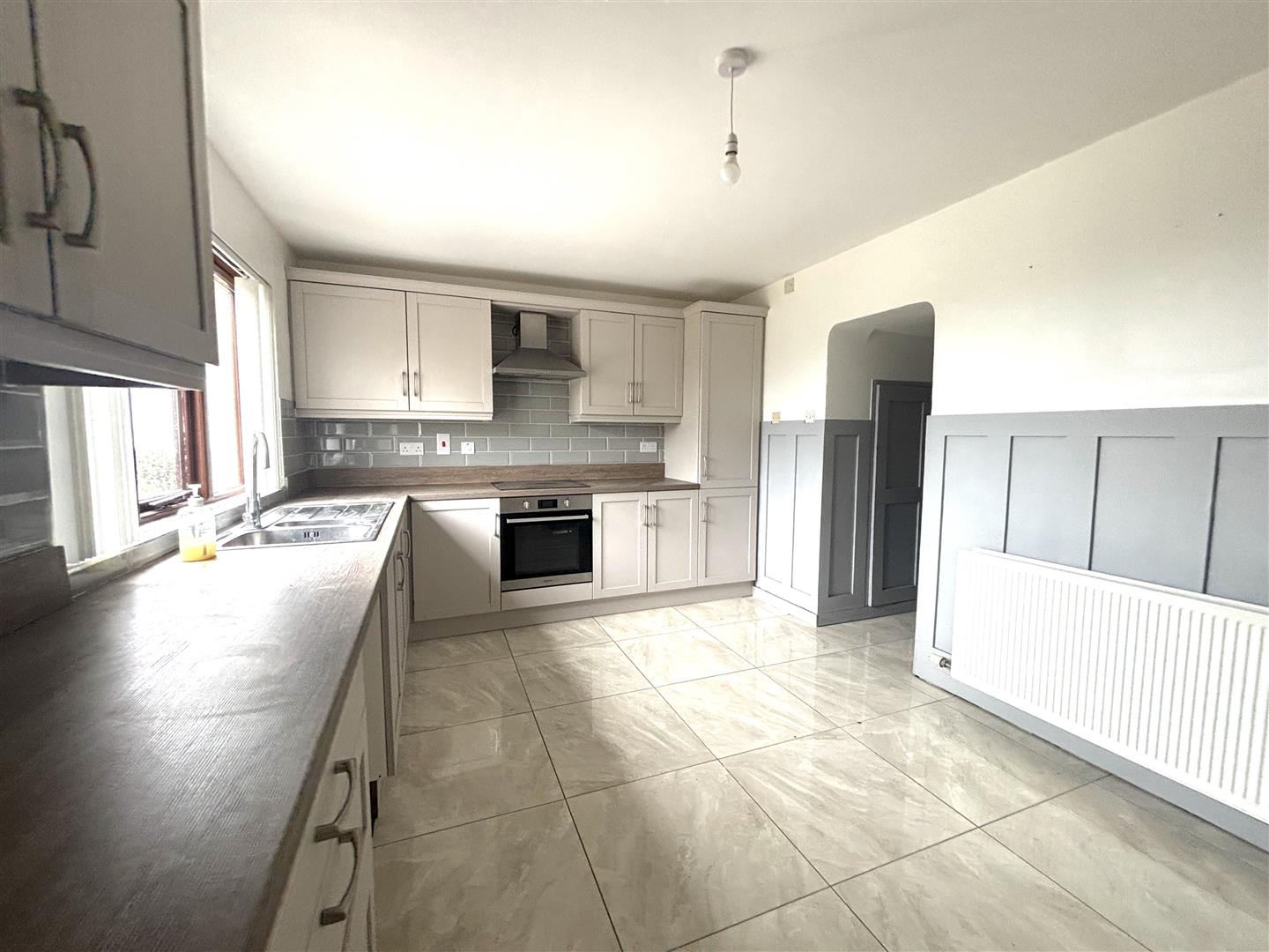 Fitted with a range of eye and low level light oak units with matching work tops. Stainless steel sink unit. Part tiled walls. Tiled floor. Corner display unit. Plumbed for automatic washing machine. Extractor fan and light. Under stairs storage.