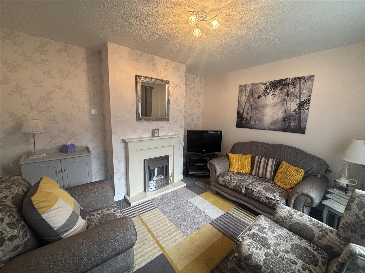 having feature wooden fireplace with electric fire insert.