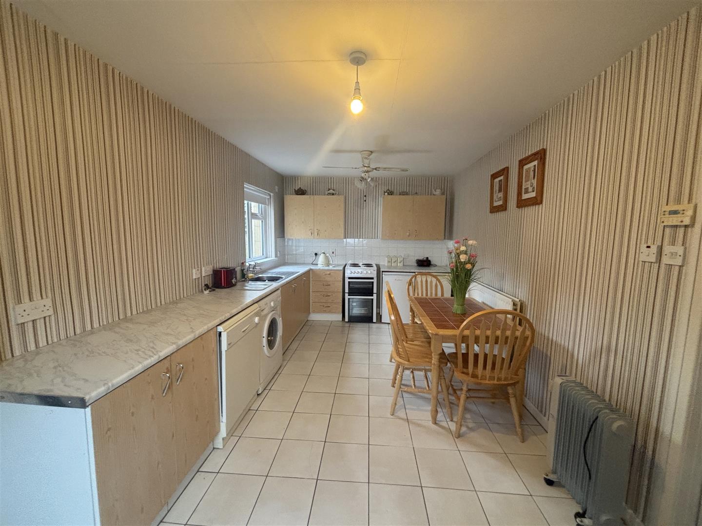 with a range of eye and low level units, matching worktop, tiled around units, stainless steel sink unit, cooker point, plumbed for automatic washing machine and dishwasher, tiled flooring.