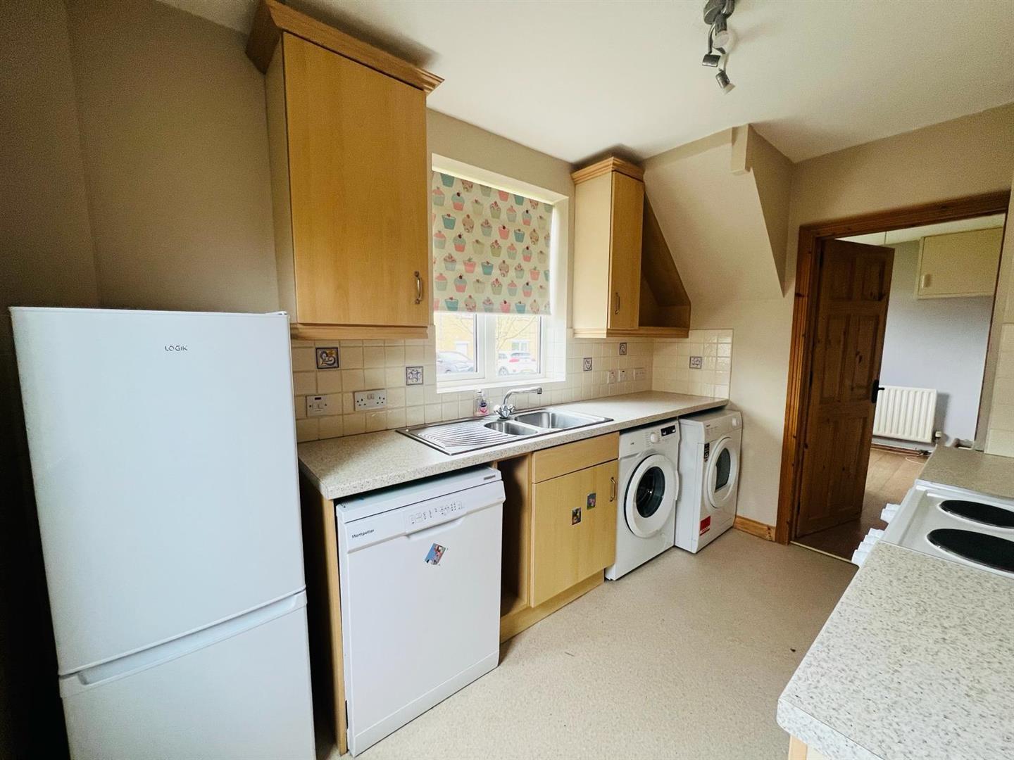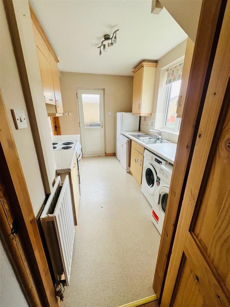 Fitted with a range of eye and low level units with matching work top. Tiled around units. Stainless steel sink unit. Cooker point. Plumbed for dishwasher. Plumbed for automatic washing machine. Cushion flooring.
