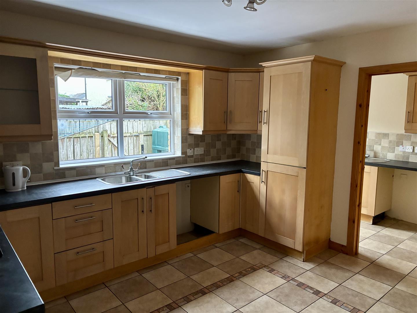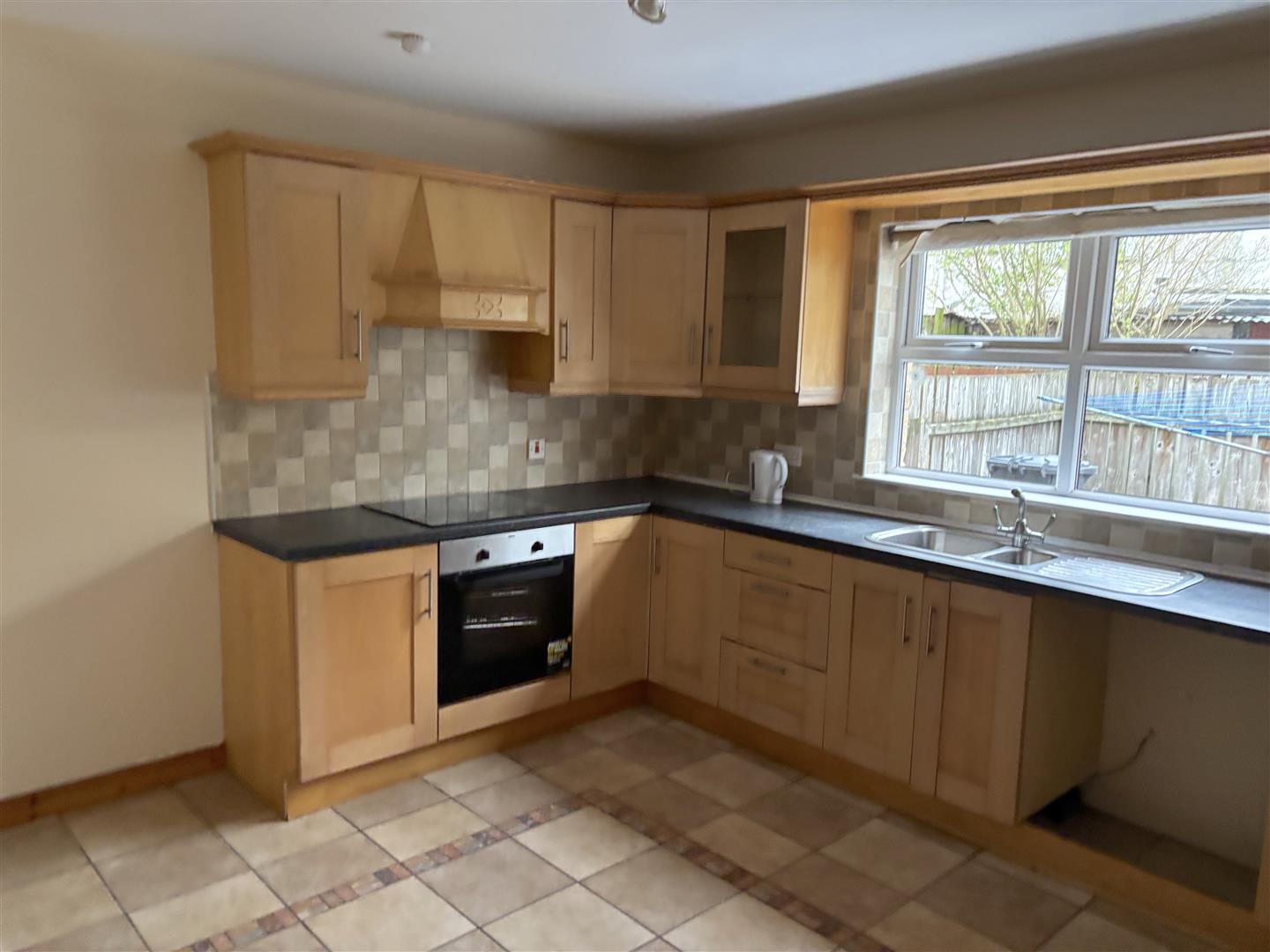 Fitted with a range of eye and low level units. Stainless steel sink unit. Built in fridge freezer. Built in hob and oven. Pelmet over window. Tiled around units. Tiled flooring.