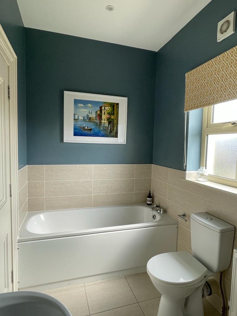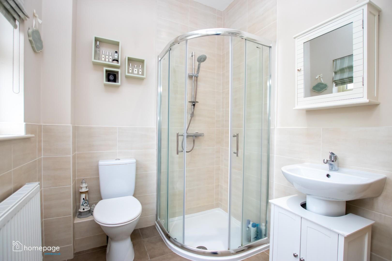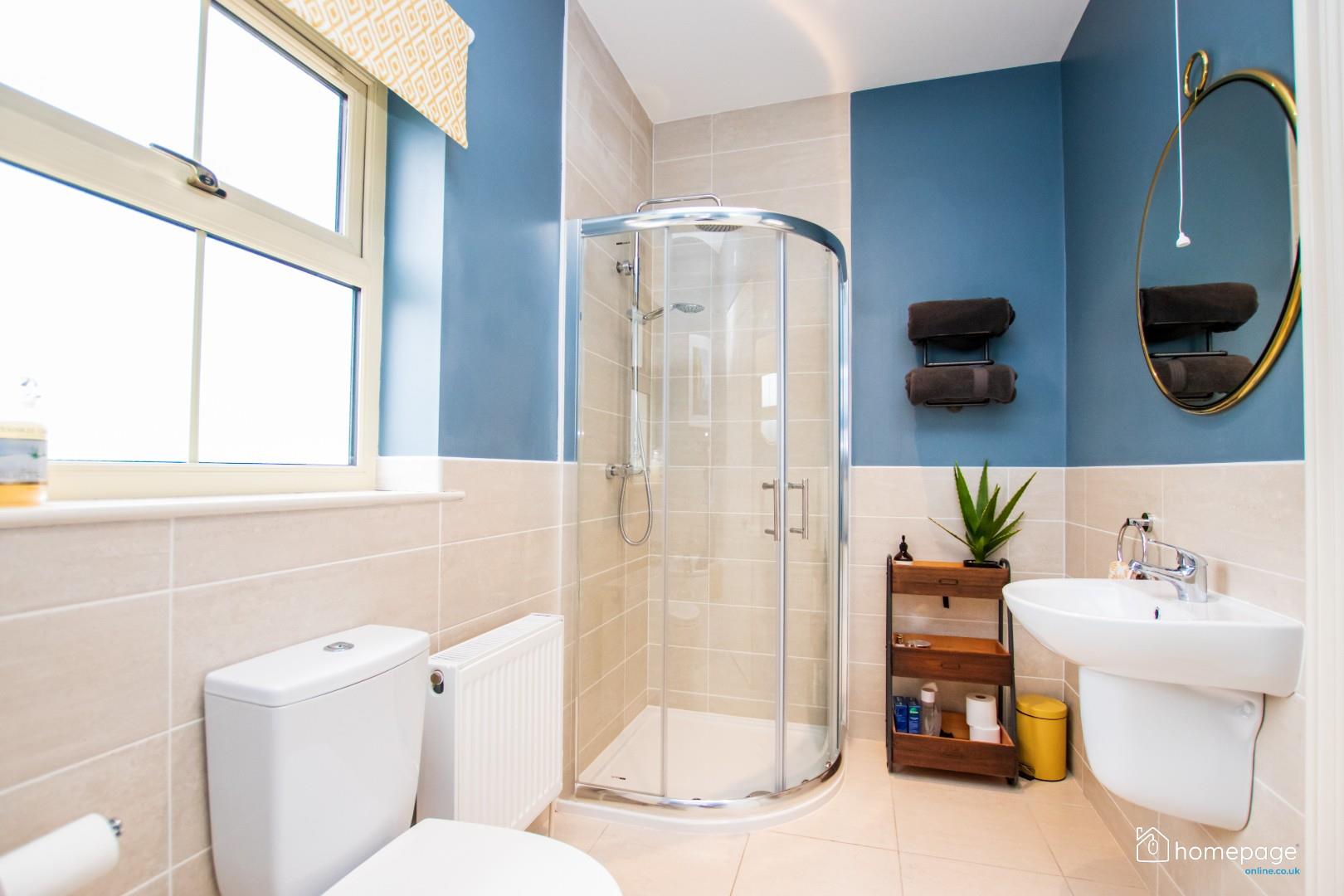 Contemporary 4 Piece bathroom suite with large shower cubicle and power shower. Bath with mixer taps, Pedestal wash hand basin. Low flush WC. High quality floor tiling, half height wall tiling with recessed spot lighting.