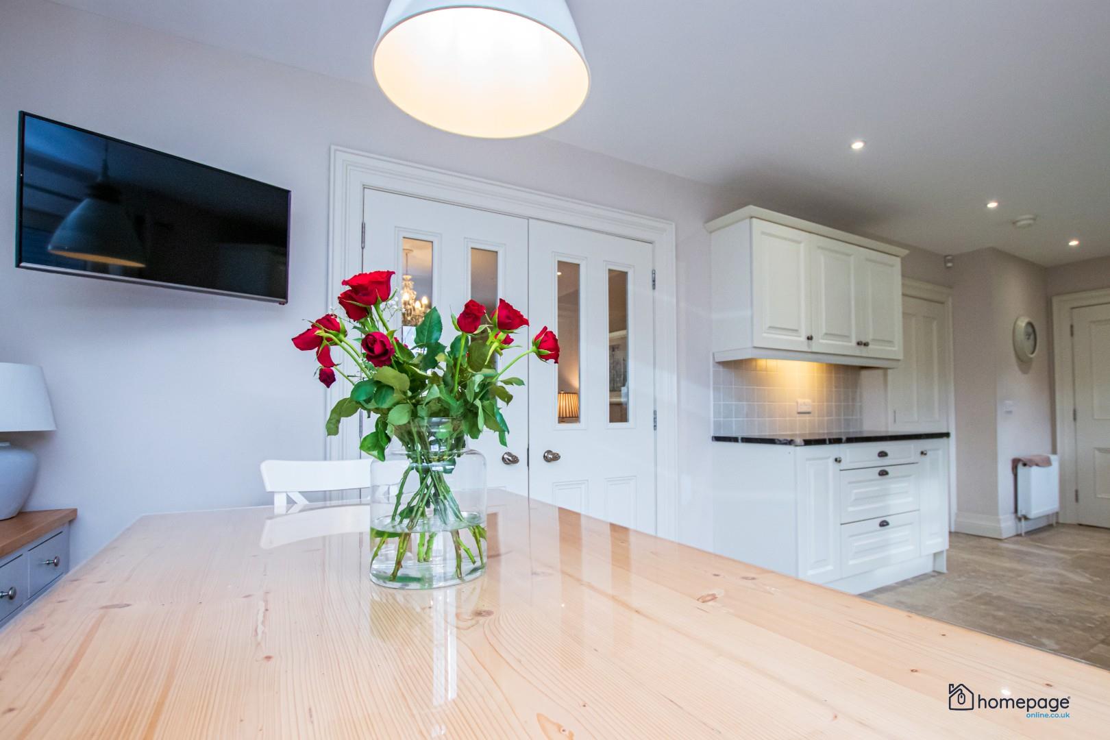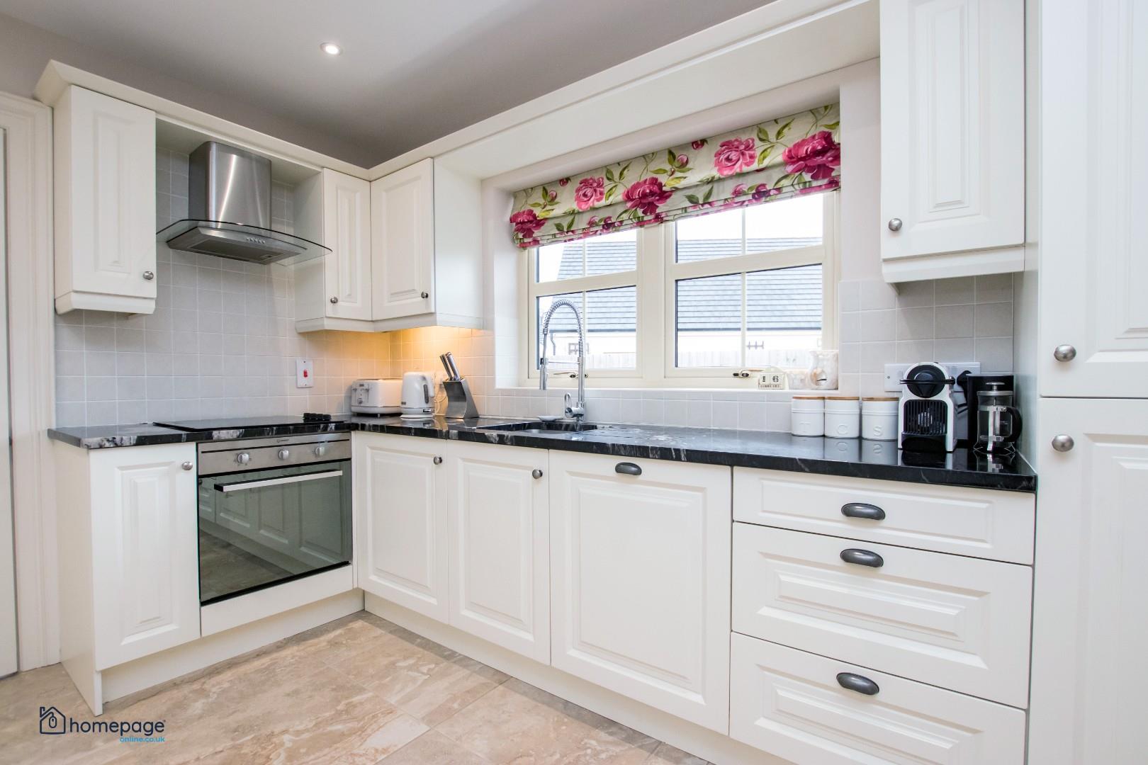 Integral dishwasher and fridge/freezer. Stainless steel underoven and matching 4 ring ceramic hob with feature canopy housing concealed extractor. Window pelmet and display lights to wall units. uPVC french doors leading external paved patio area and rear garden.