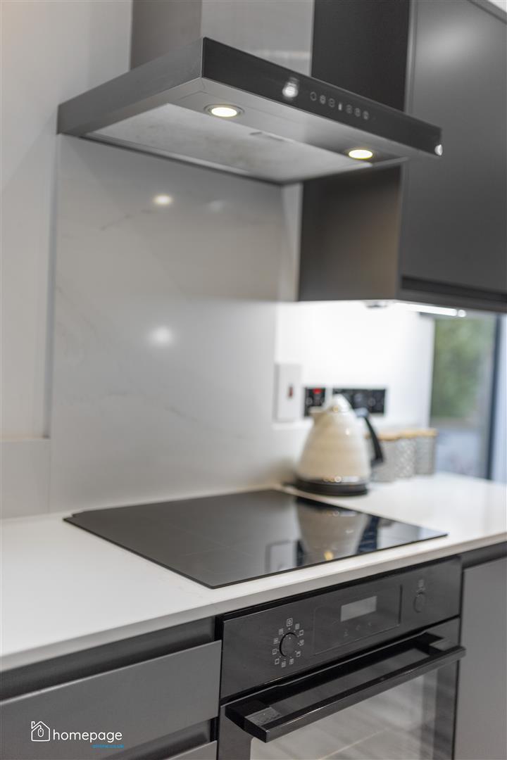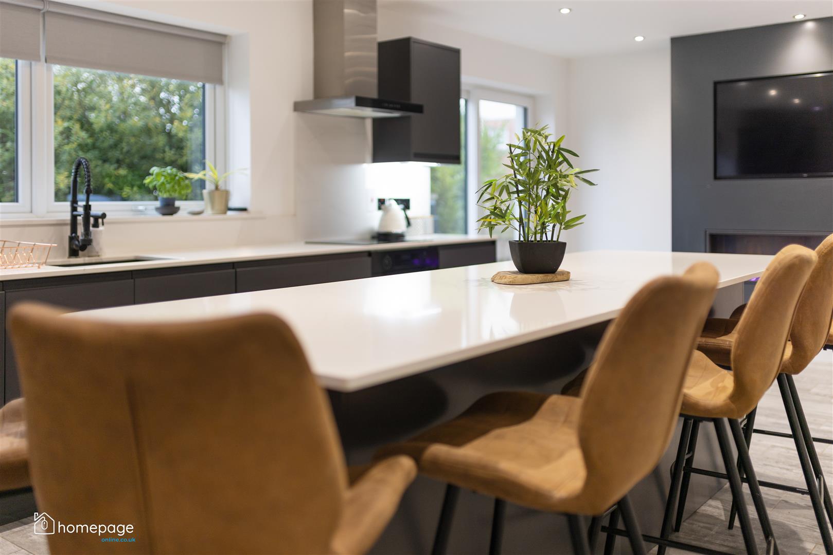 The large open plan kitchen / dining space is fitted with a wide range of high and low level storage , solid wood modern handleless doors, Calcutta gold quartz worktops, upstand & splashback, electric hob & ovens, upgraded appliances to include American fridge freezer and integrated dishwasher, extended 6 seat centre island, high quality tiling and a range of chrome sockets and spot lights throughout.