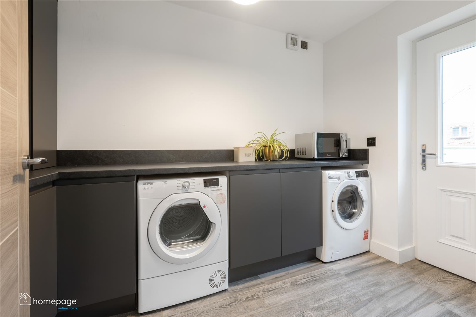 The convenient utility room has provision for washing machine and separate dryer with built in high and low level storage.