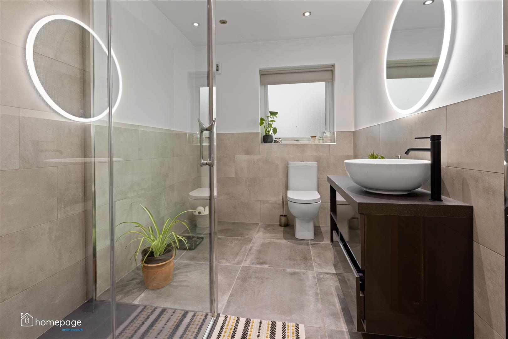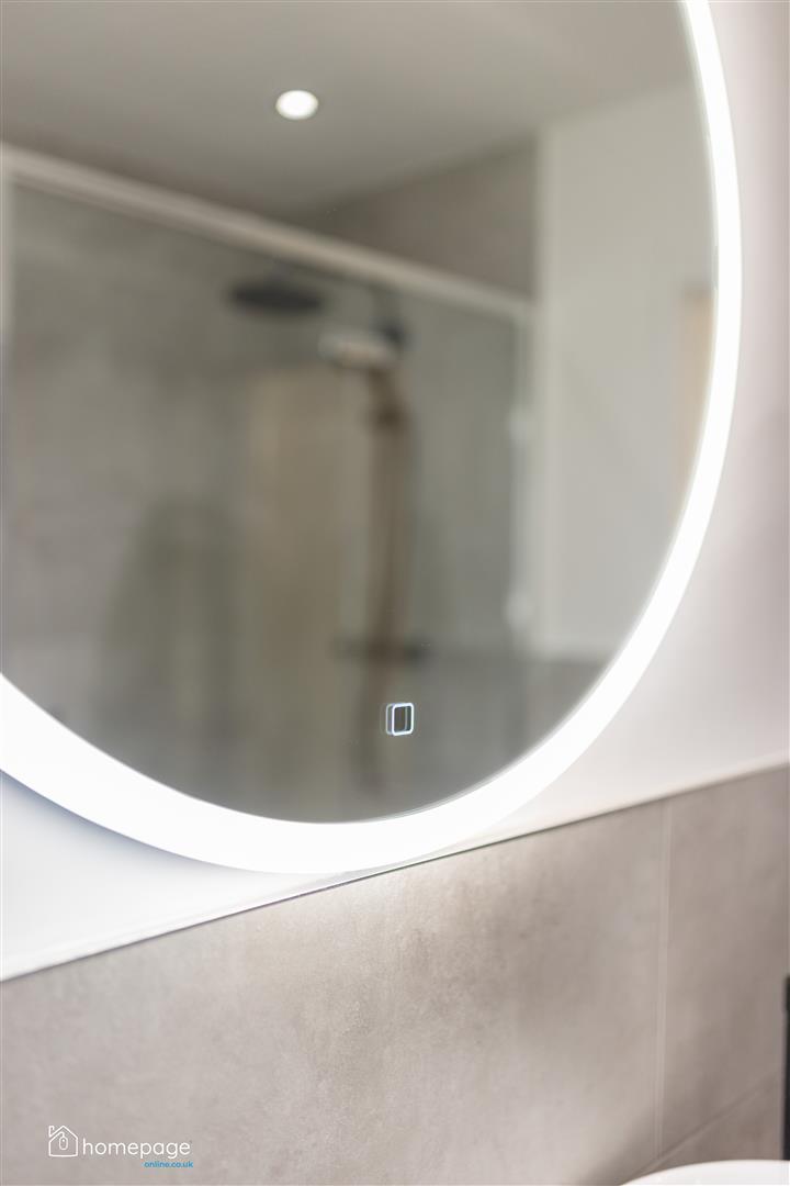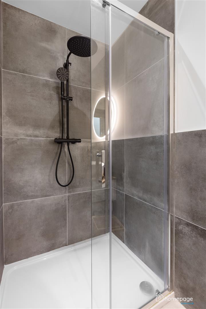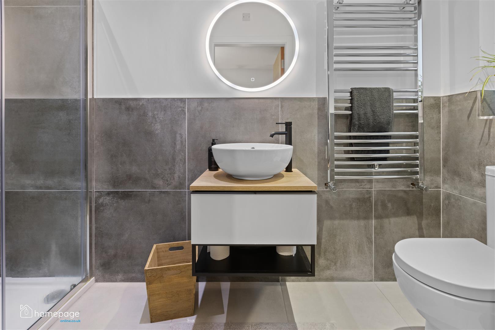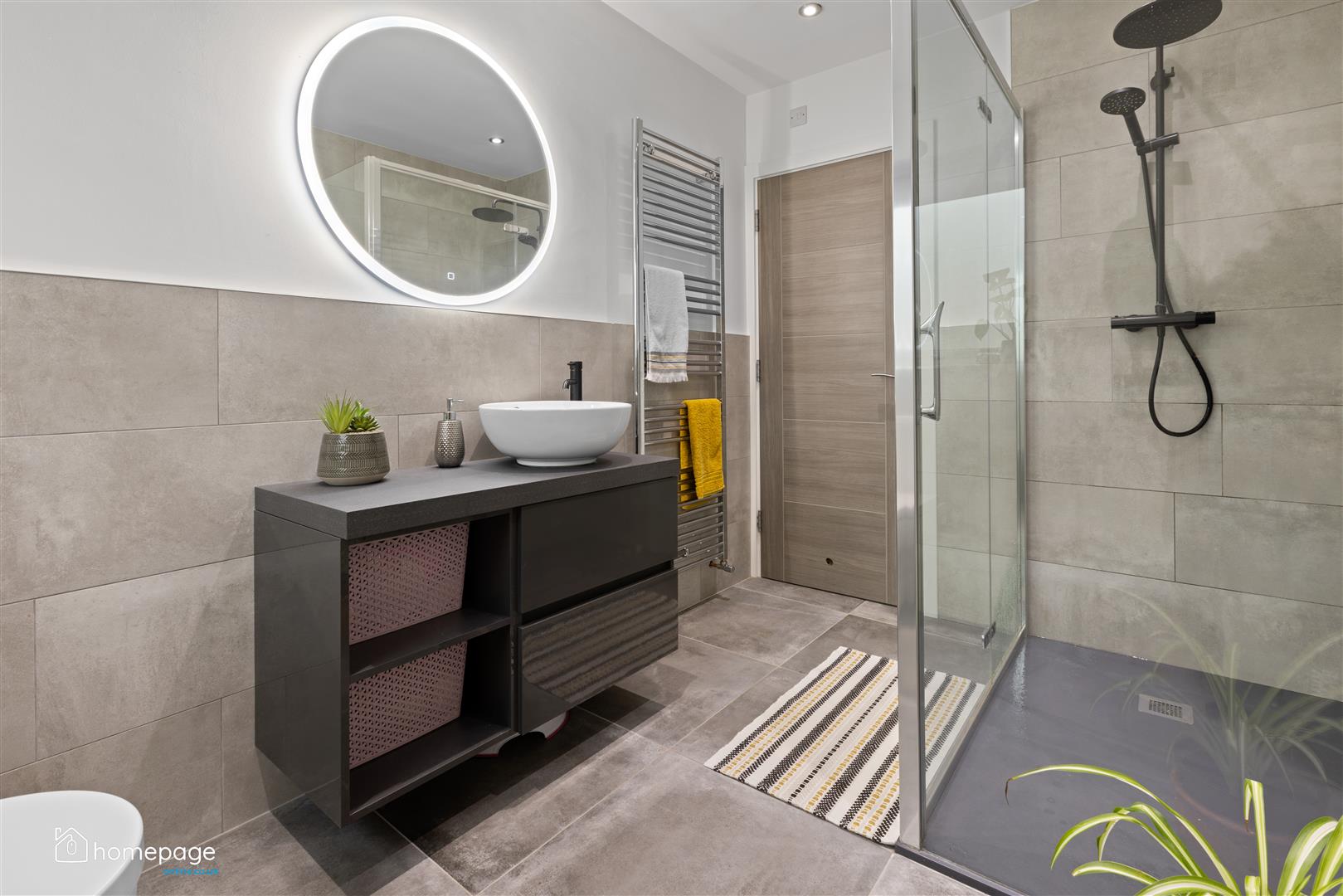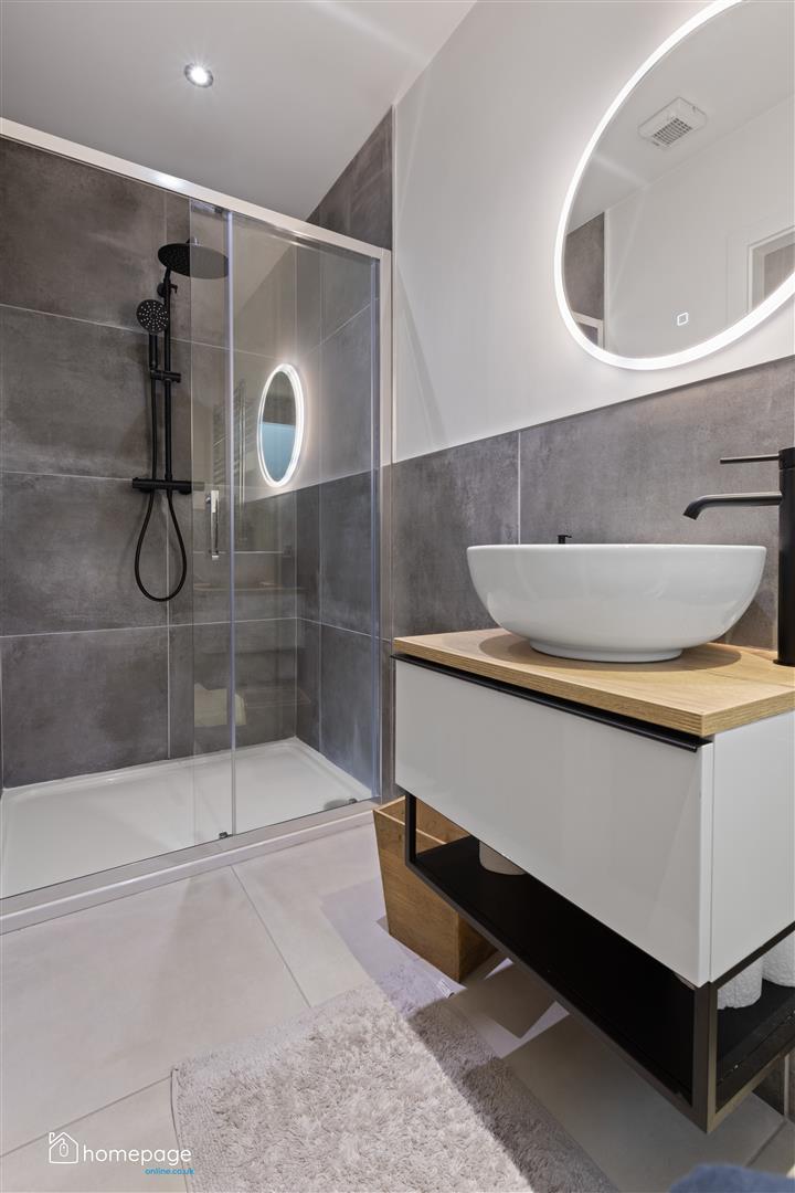 The bathrooms benefits from upgraded half height `wet room style´ wall tiling, chrome towel rail, floating vanity unit and large shower tray with black fittings.