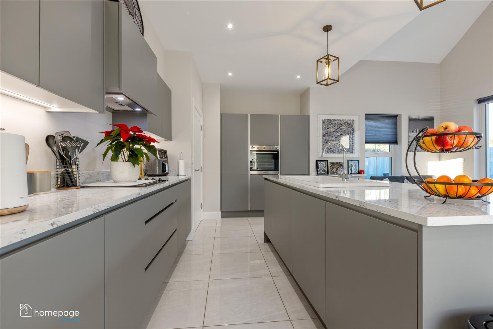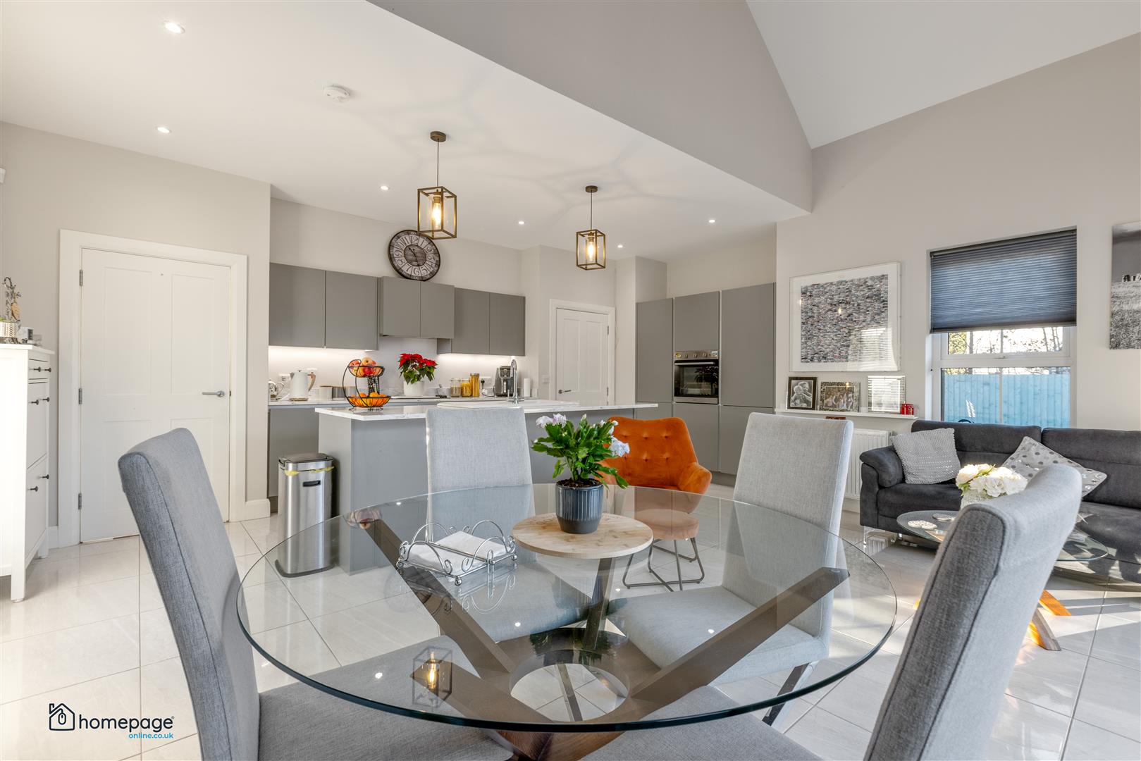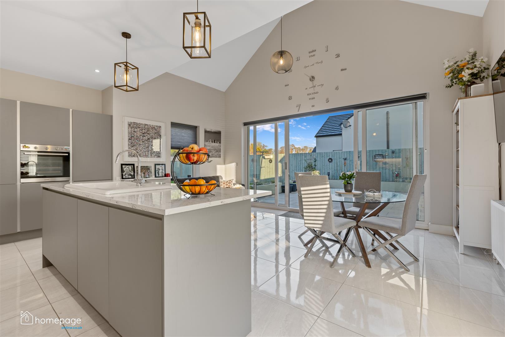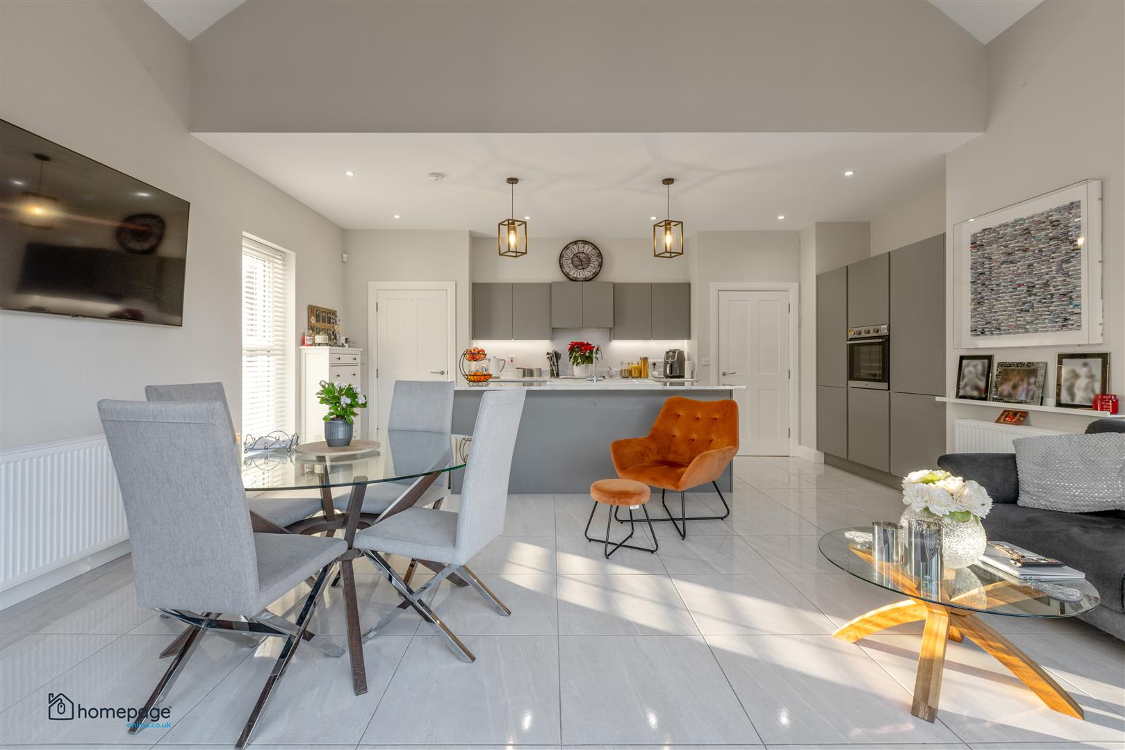 The large open plan kitchen / dining space is fitted with a wide range of high and low level storage, contemporary soft close doors, slimeline worktops with upstand, electric hob , high level oven, integrated dishwasher, centre island with seating and feature lighting, high quality tiling and spot lights throughout.